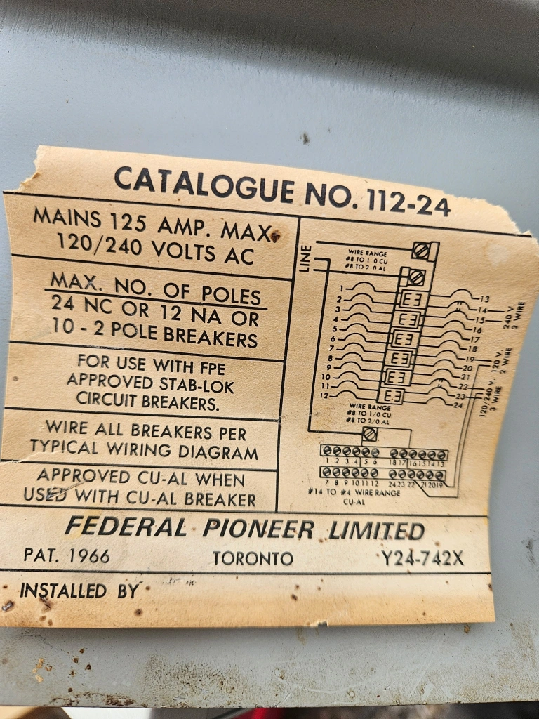 Federal Pioneer Stab-Lok circuit breaker panel. It i is rated for 125 Amp max, 120/240 Volts AC. It can handle a max number of poles: 24 NC or 12 NA or 10-2 pole breakers. Approved for CU-AL when used with CU-AL breaker.