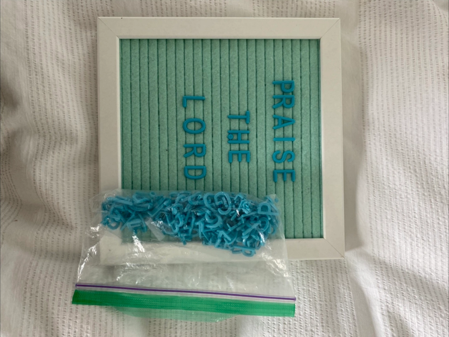 Selling a letter board with a white frame and a set of blue letters. It's in great condition and ready for your creative messages! Perfect for home decor or special announcements