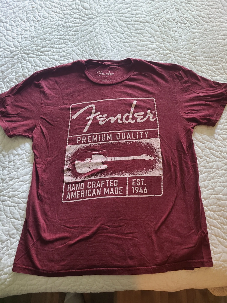 Selling a Fender Premium Quality T-shirt in size large! The shirt is a nice burgundy colour and features a cool guitar graphic. It's in great condition and ready for a new home!