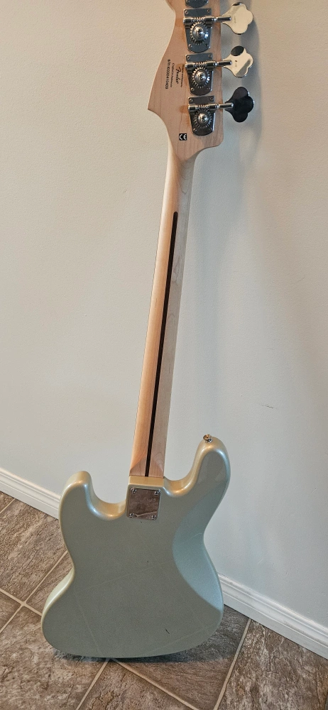 Rare shoreline gold Fender Squier Jazz Bass guitar. It's in good used condition!