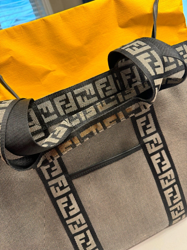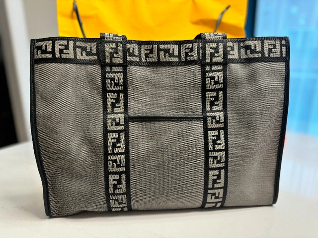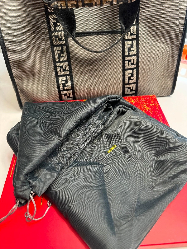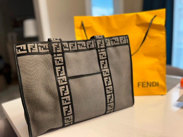 Genuine FENDI Briefcase /Laptop Bag. Previously enjoyed and well-loved. Purchased for $2,500. 15.5' X 12.5' One external and one internal pocket. Materials are made from drummed calfskin, fabric and leather trims. Dust bag and original shopping bag included . Some stains on handle and inside zipper tab is broken (but zipper itself works). Price firm. Please read all the descriptions and look at the photos carefully before messaging for any further questions.