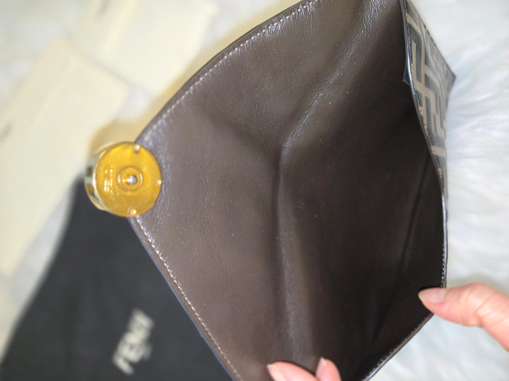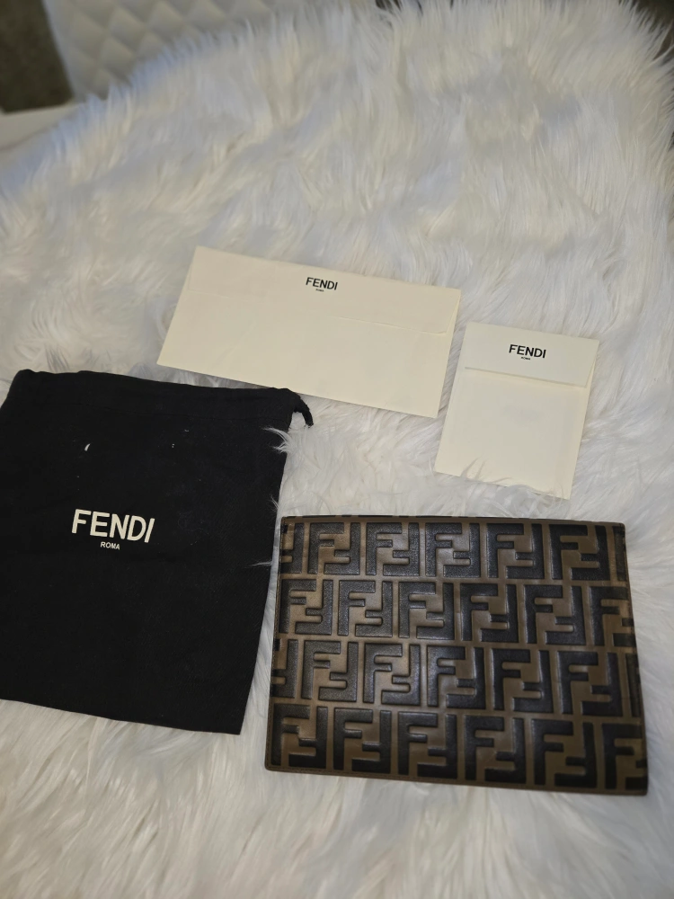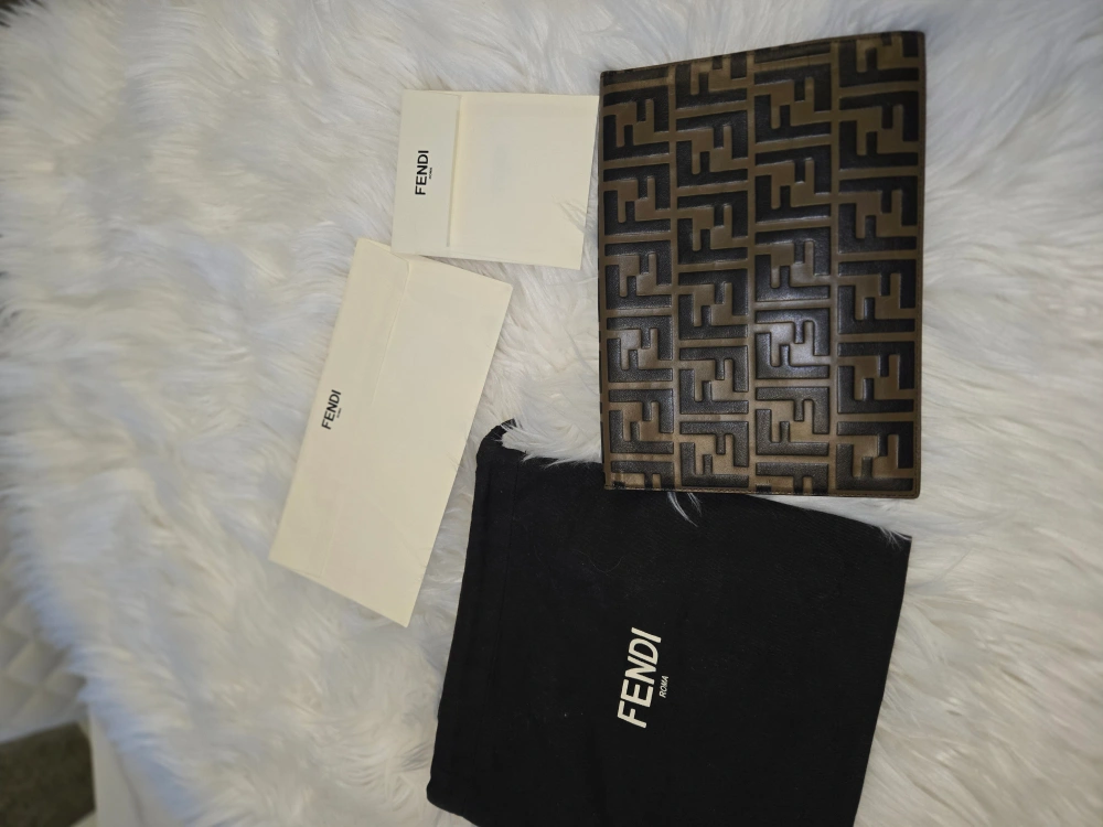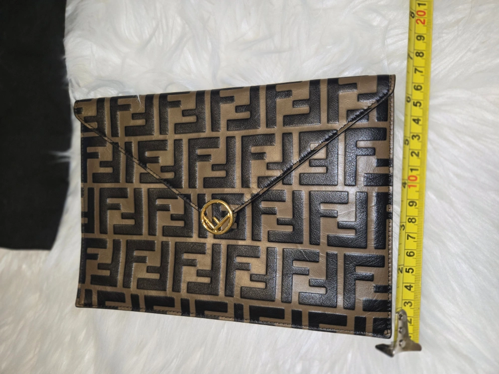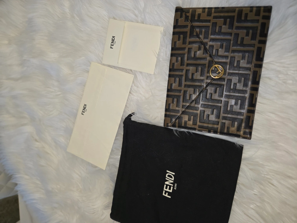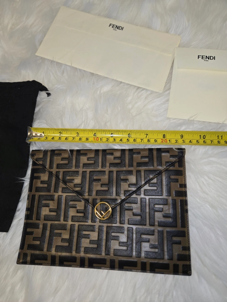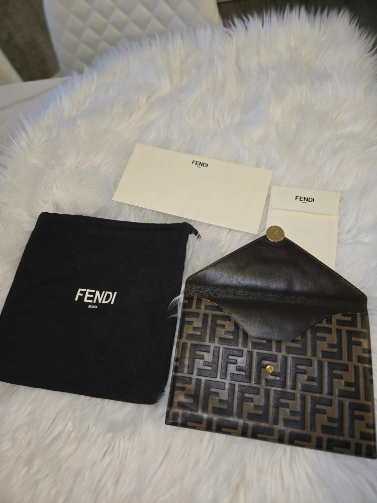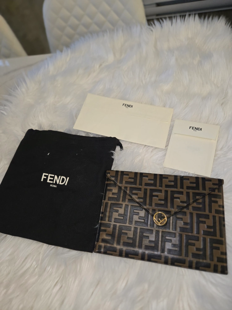Authentic Fendi clutch. Brown leather with Fendi logo pattern. rds. Envelope style closure. comes with the receipt and dust bag.