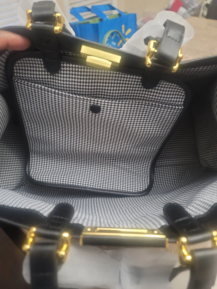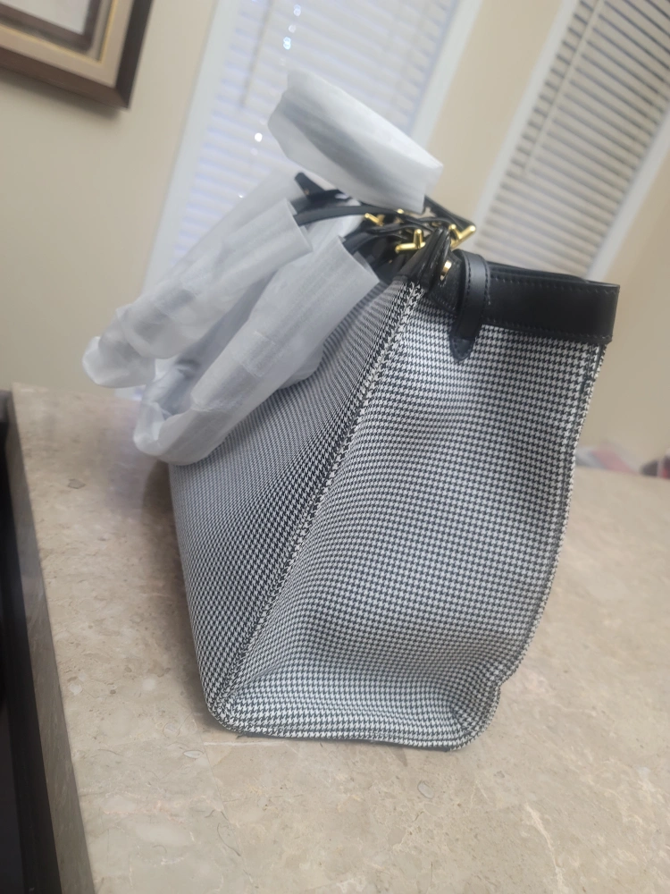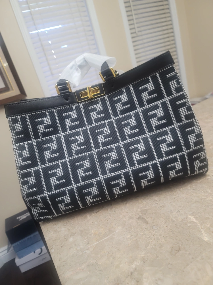 Selling a stylish Fendi tote bag featuring a classic houndstooth pattern. This eye-catching bag is perfect for adding a touch of sophistication to any outfit. The interior is lined with a matching houndstooth fabric and includes a convenient pocket. It's in great condition and ready for a new home!