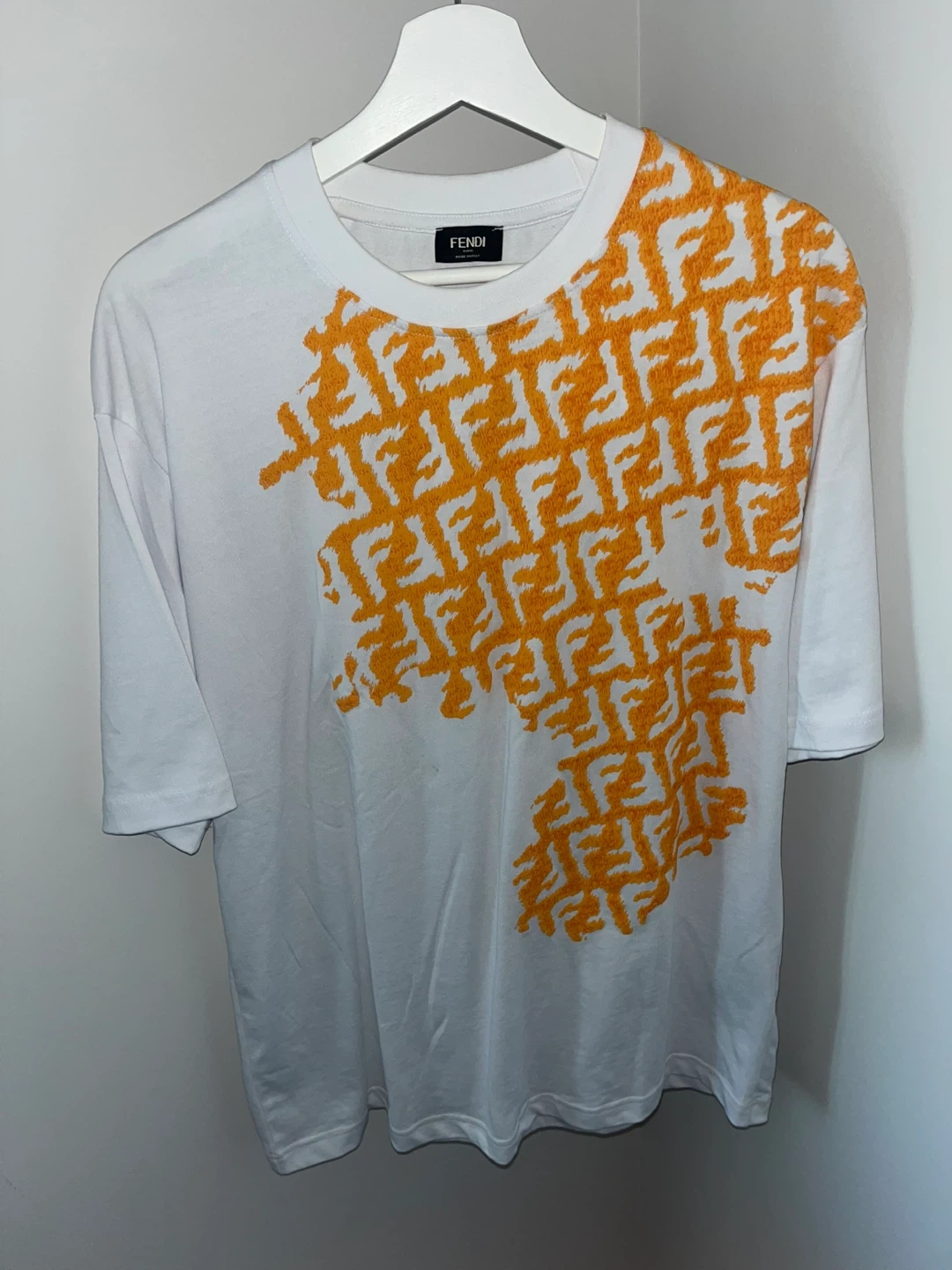 Selling a Fendi T-shirt in white with a bold orange FF logo design. This shirt is in great condition and ready for a new home! The material feels soft and comfortable, perfect for casual wear. A stylish piece from Fendi to elevate your wardrobe