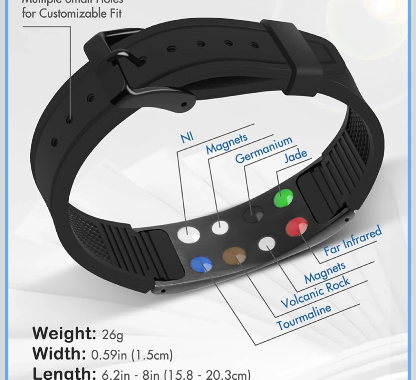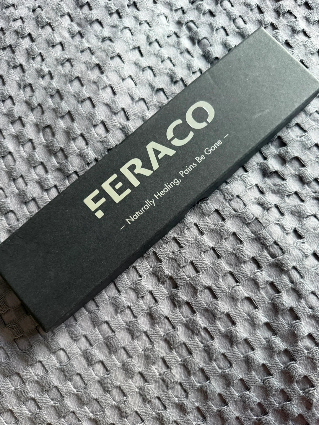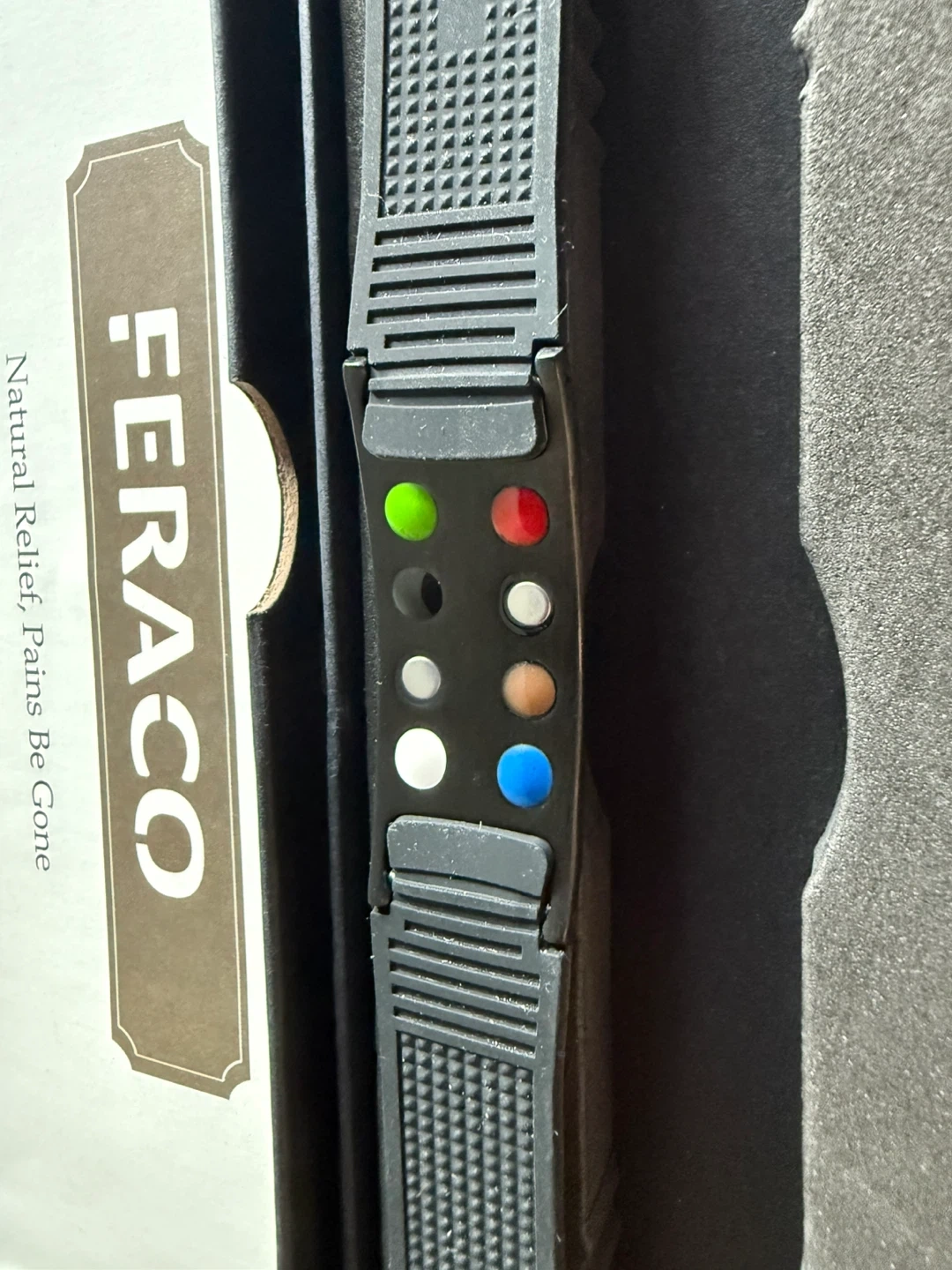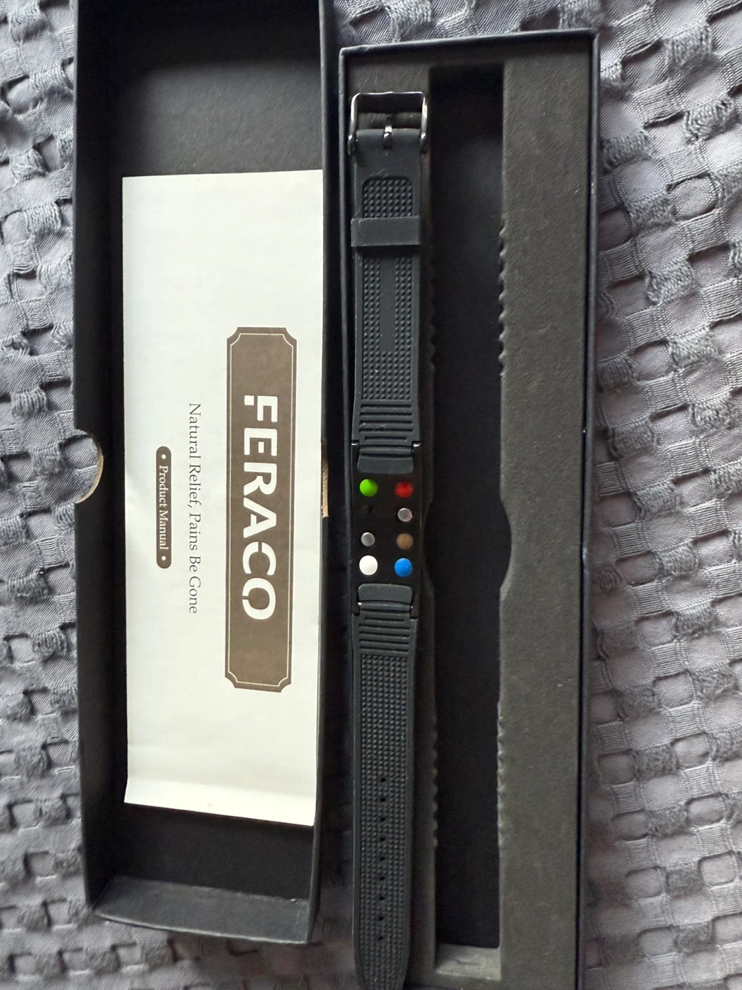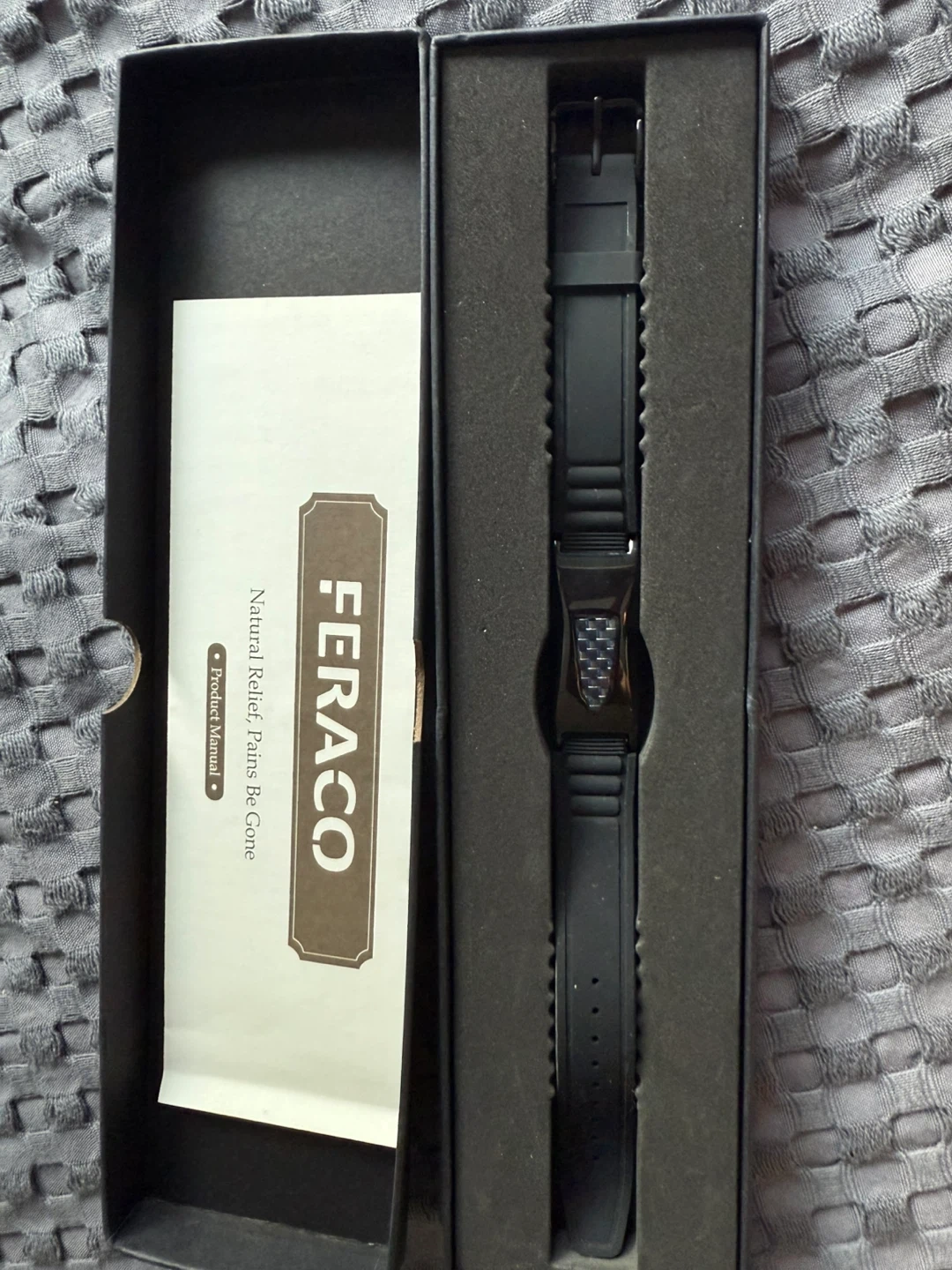 Selling a FERACO natural healing bracelet. It comes with its original box and product manual. The bracelet features multiple small holes for a customizable fit and includes NI magnets, germanium, jade, far-infrared, volcanic rock, and tourmaline. It is designed to provide natural relief and help with pain. The bracelet's length is 6.2in - 8in (15.8 - 20.3cm) and it weighs 26g