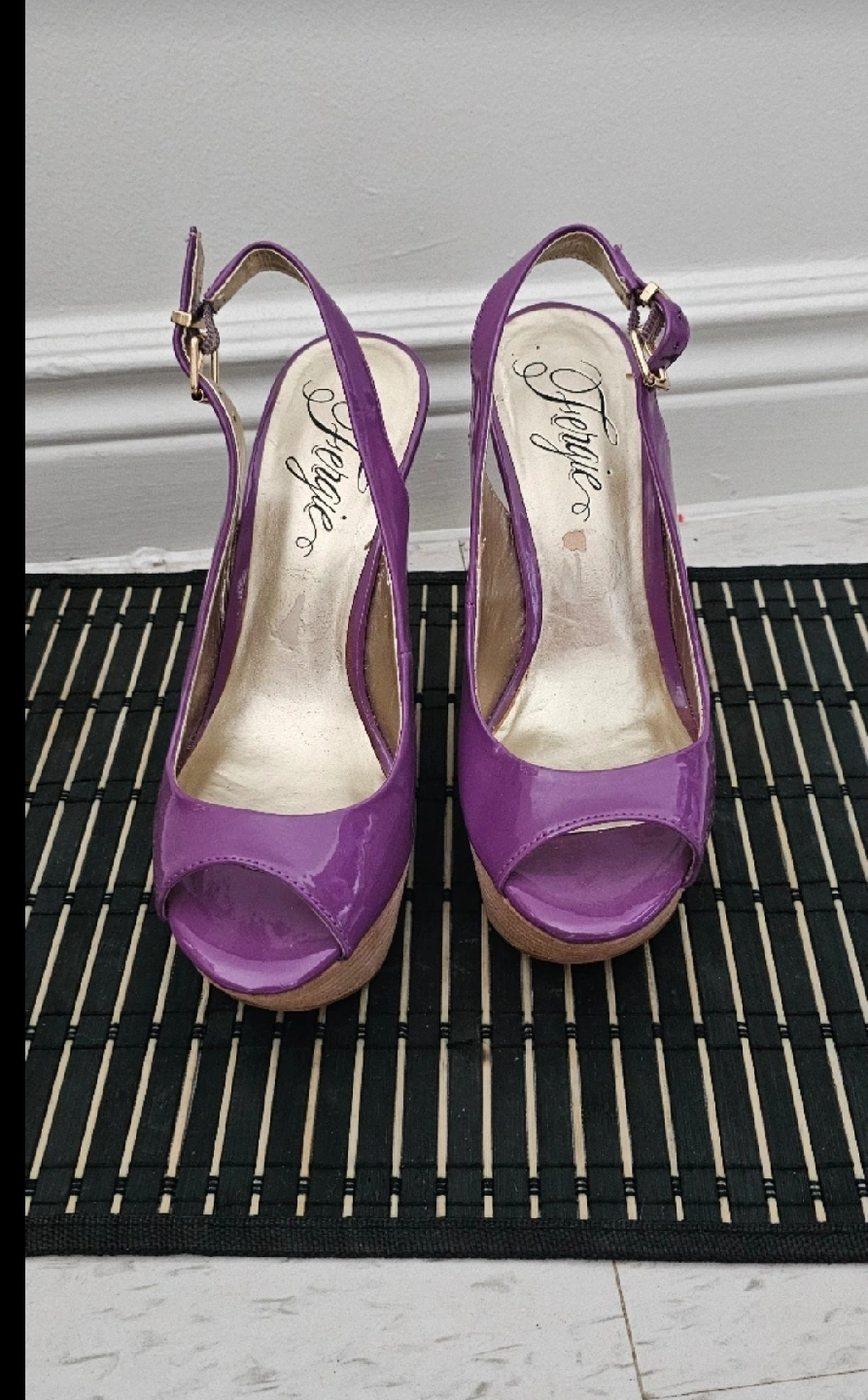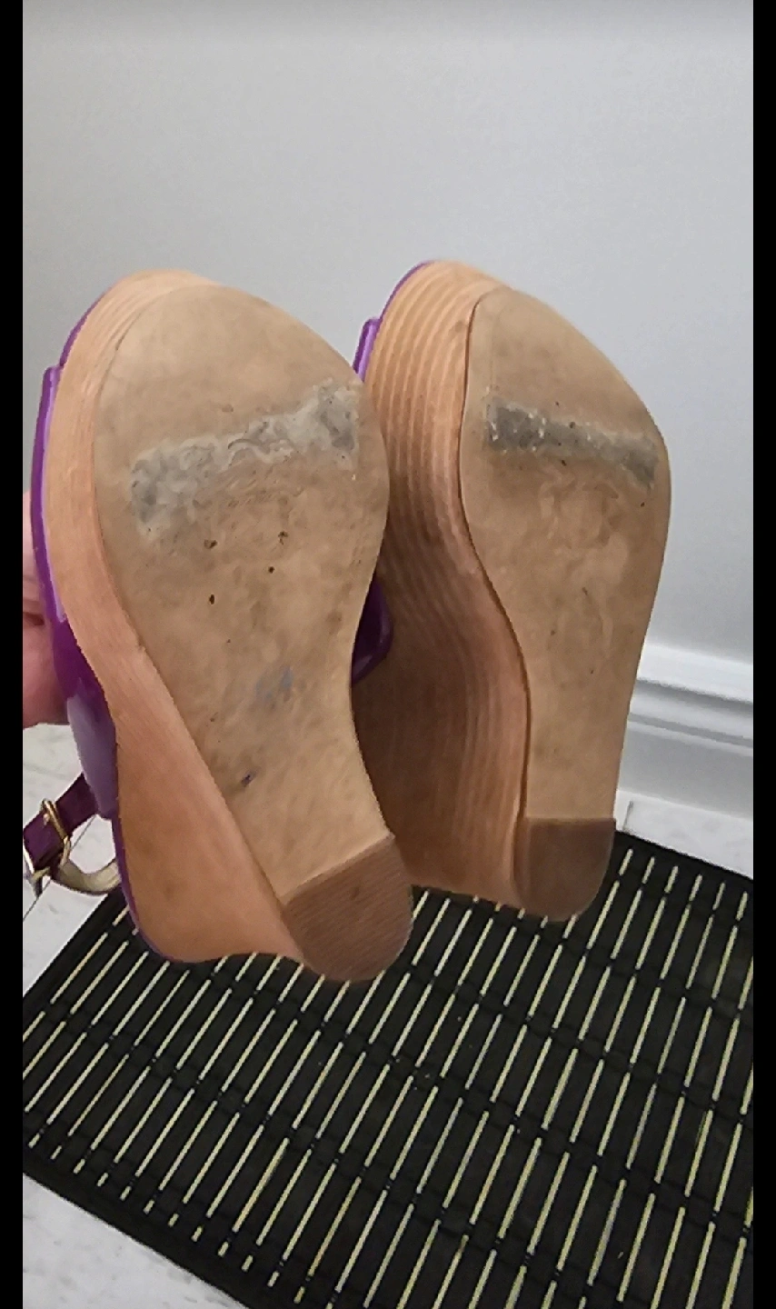 These are a pair of Fergie brand purple wedge heels in a size 7. They have a slingback strap and an open toe. There are some signs of wear on the soles, but otherwise they are in good condition