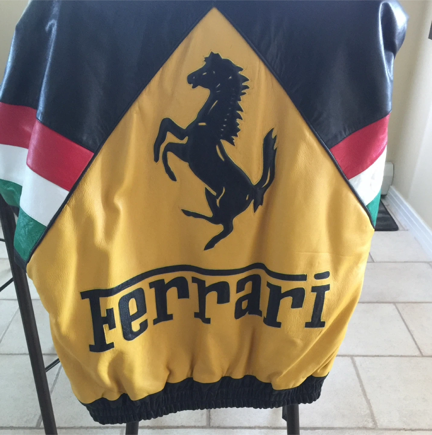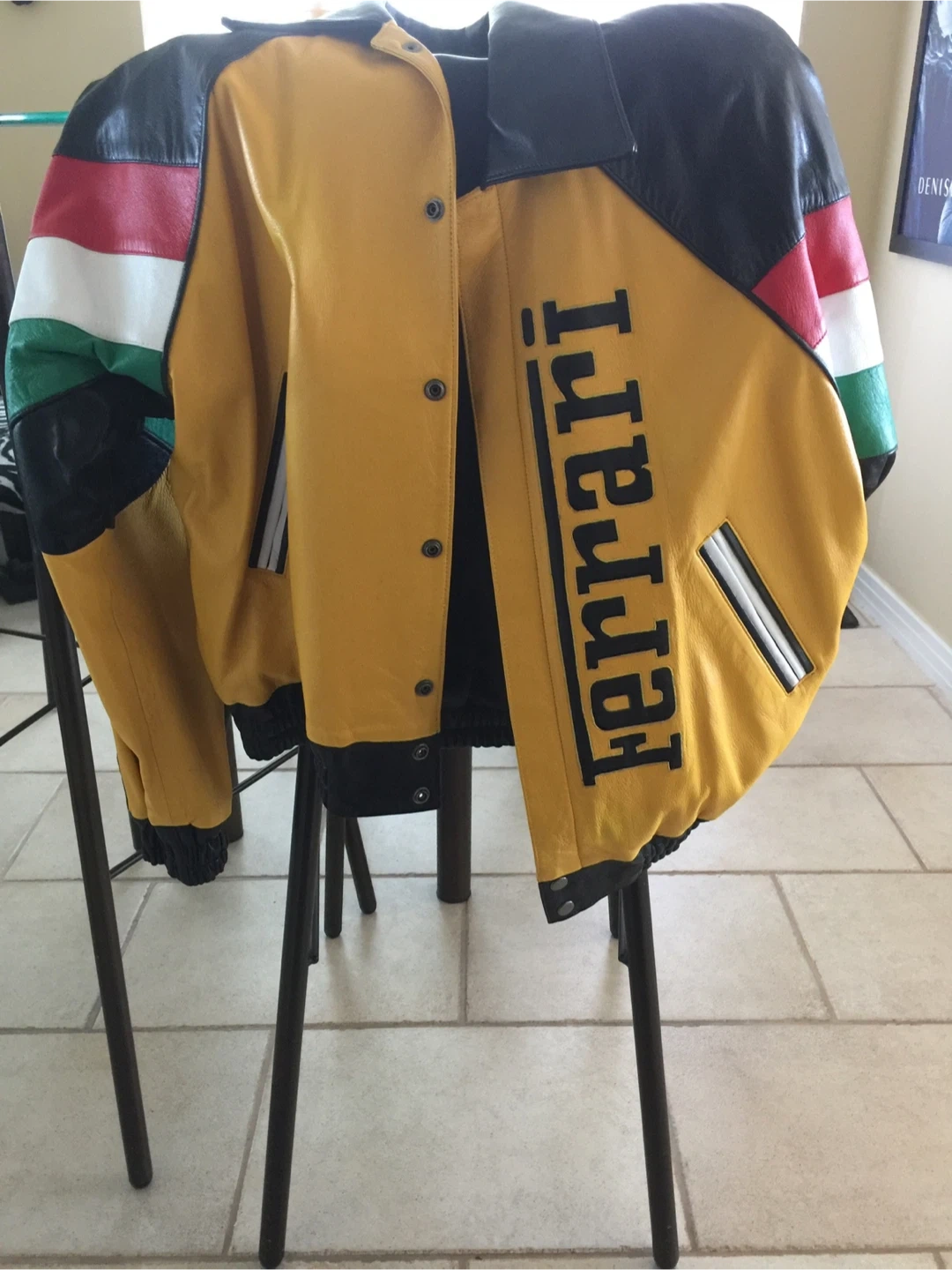 Selling a cool Ferrari leather jacket! It's a vibrant yellow with the Ferrari logo prominently displayed. The jacket also features black, red, white, and green accents. A stylish piece for any Ferrari enthusiast! Only worn once.