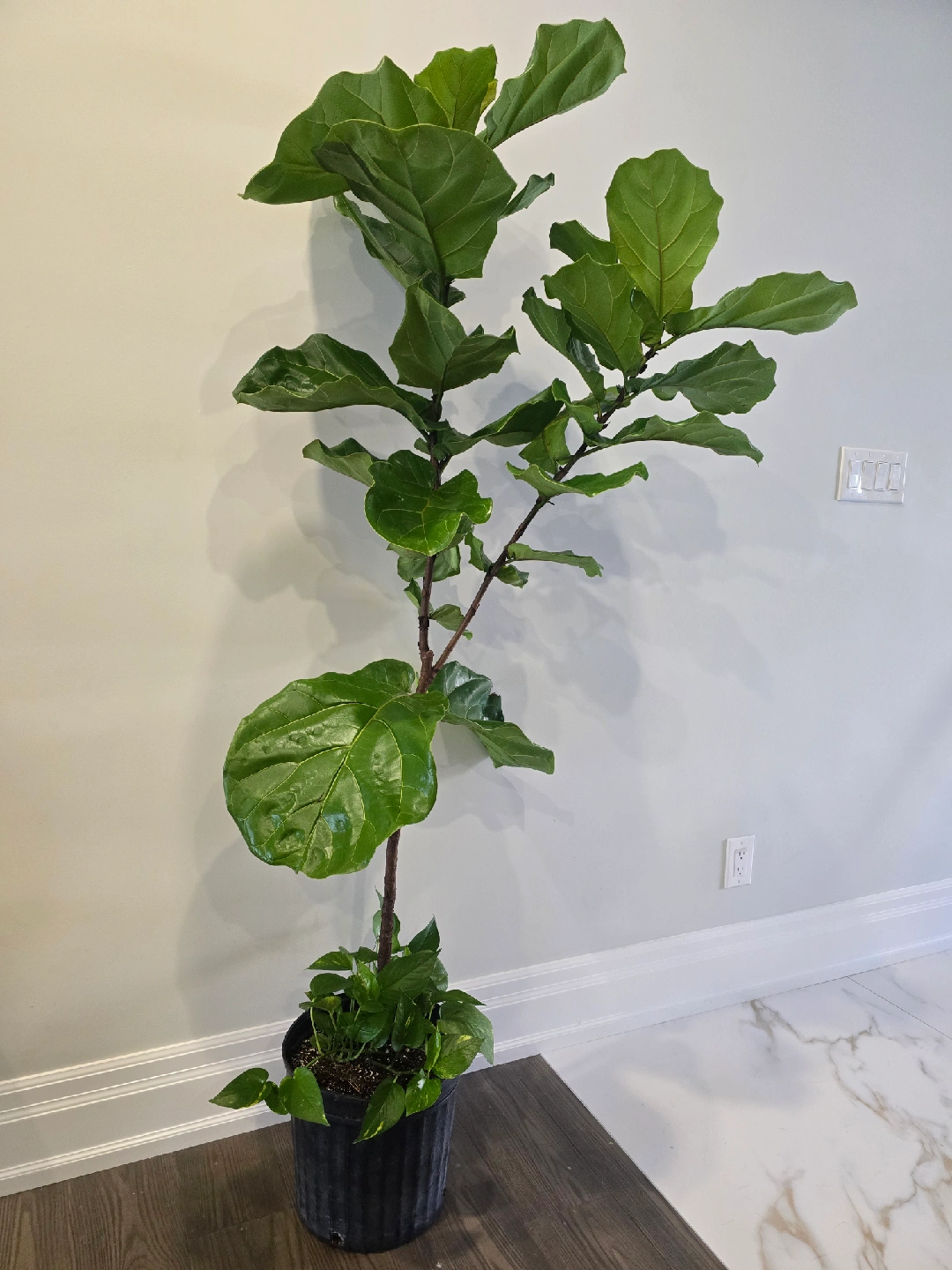 Selling a healthy fiddle leaf fig tree! It's a beautiful plant that would look great in any home. It comes in a black plastic pot and includes a small pothos plant at the base.