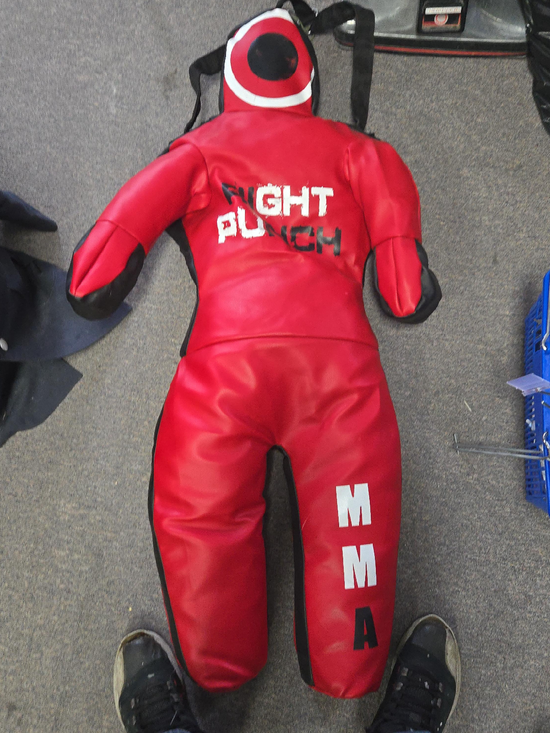 Selling a Fight Punch MMA dummy! It's red and black and in good condition. Perfect for practicing your strikes and takedowns. It has MMA written on the side.