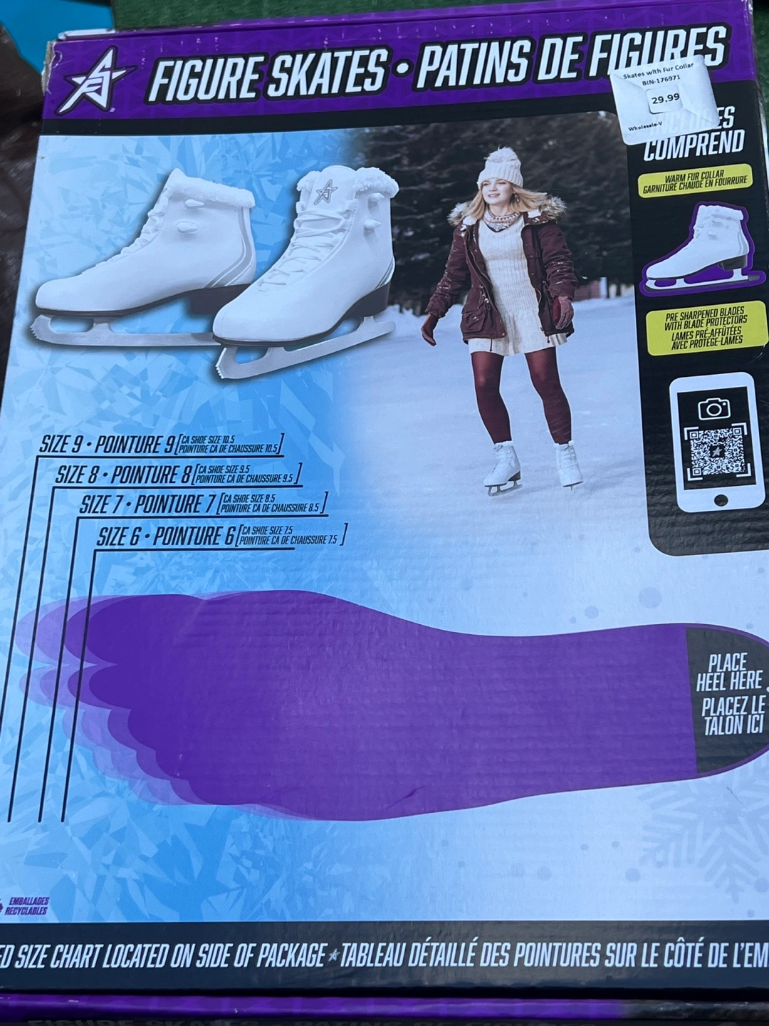 Selling a pair of figure skates, size 9! They come with warm fur collars and pre-sharpened blades with blade protectors. The box includes a size chart located on the side, so you can double-check the fit