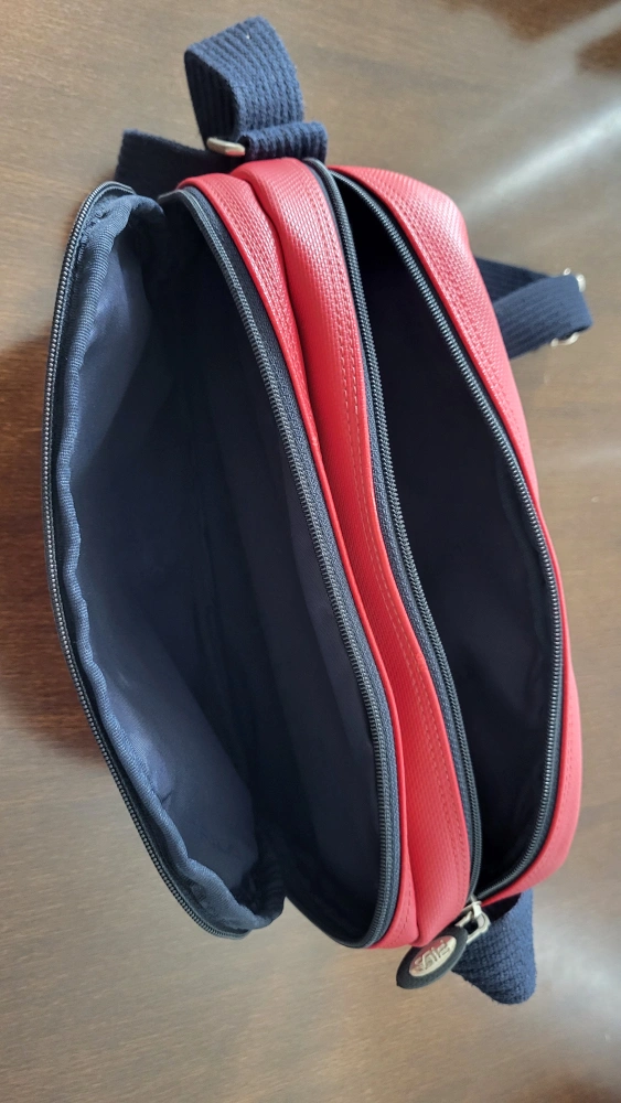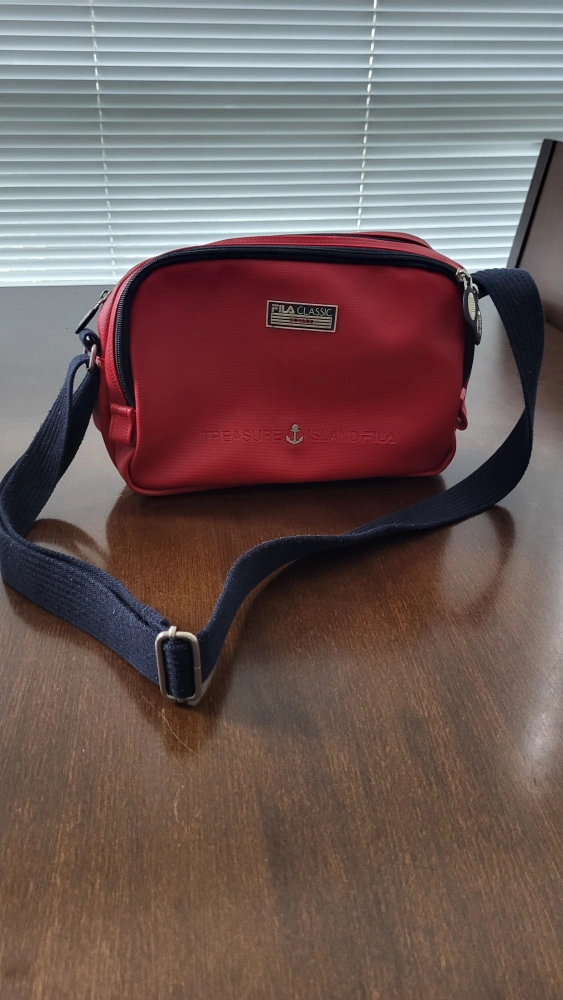 This is a Fila Classic shoulder bag in red. It features a navy blue strap and a 'Treasure Island' design detail. It is in good condition and ready for a new home!