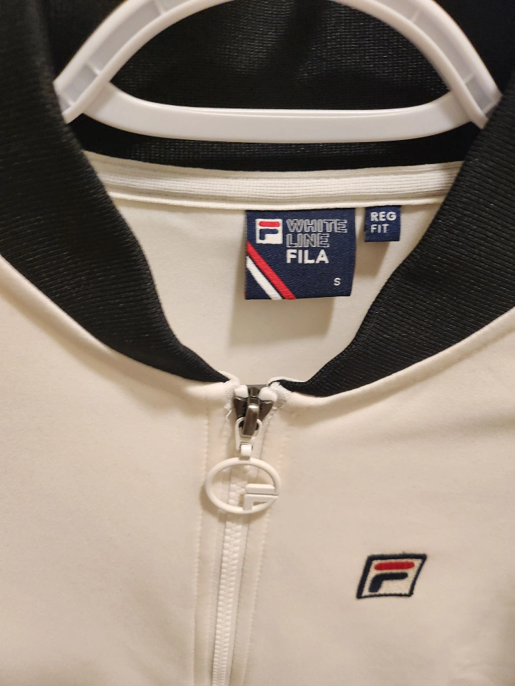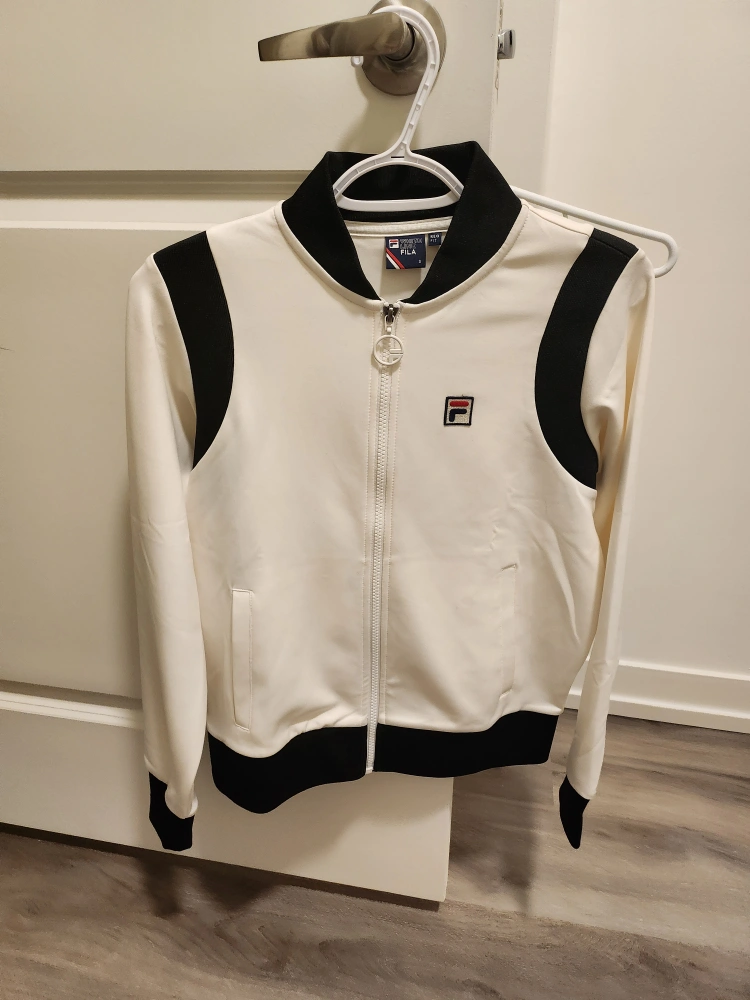 Women's Fila track jacket. Size small. White with black accents. Zip-up front. Good condition.