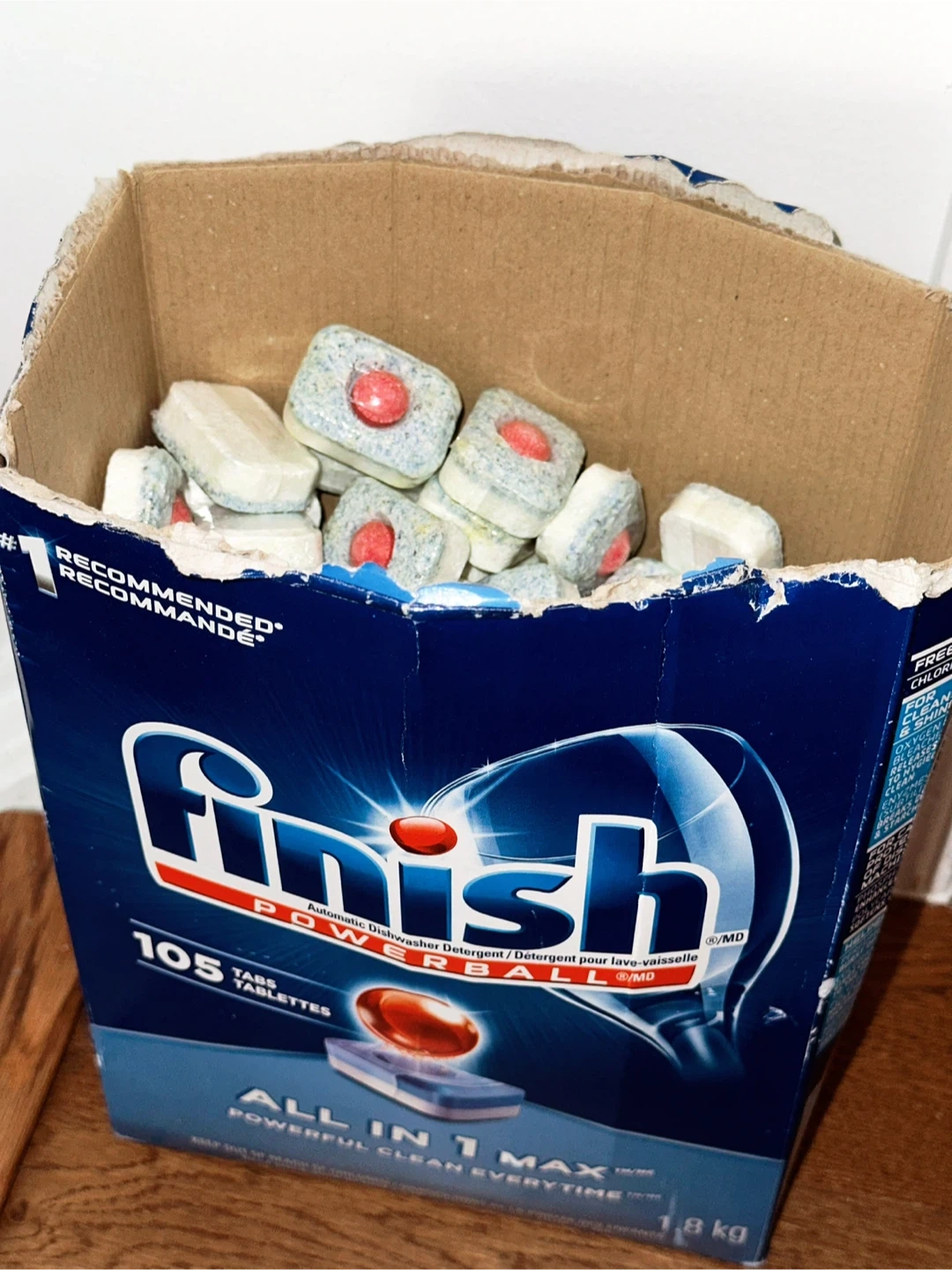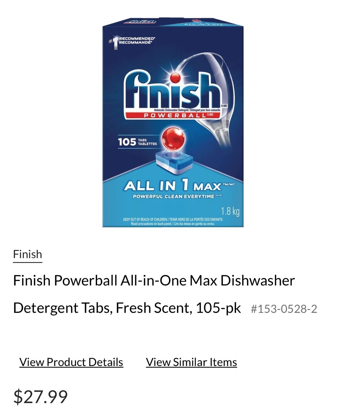 Selling a box of Finish Powerball All-in-One Max dishwasher detergent tabs. This is the fresh scent version, and the box contains 105 tabs. These are all in one max for powerful clean every time! $20 fcfs
