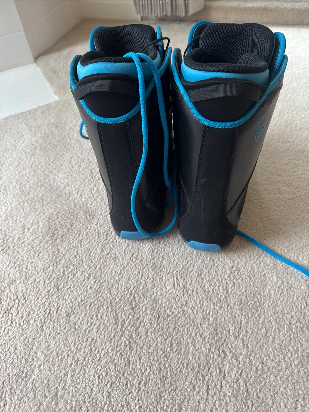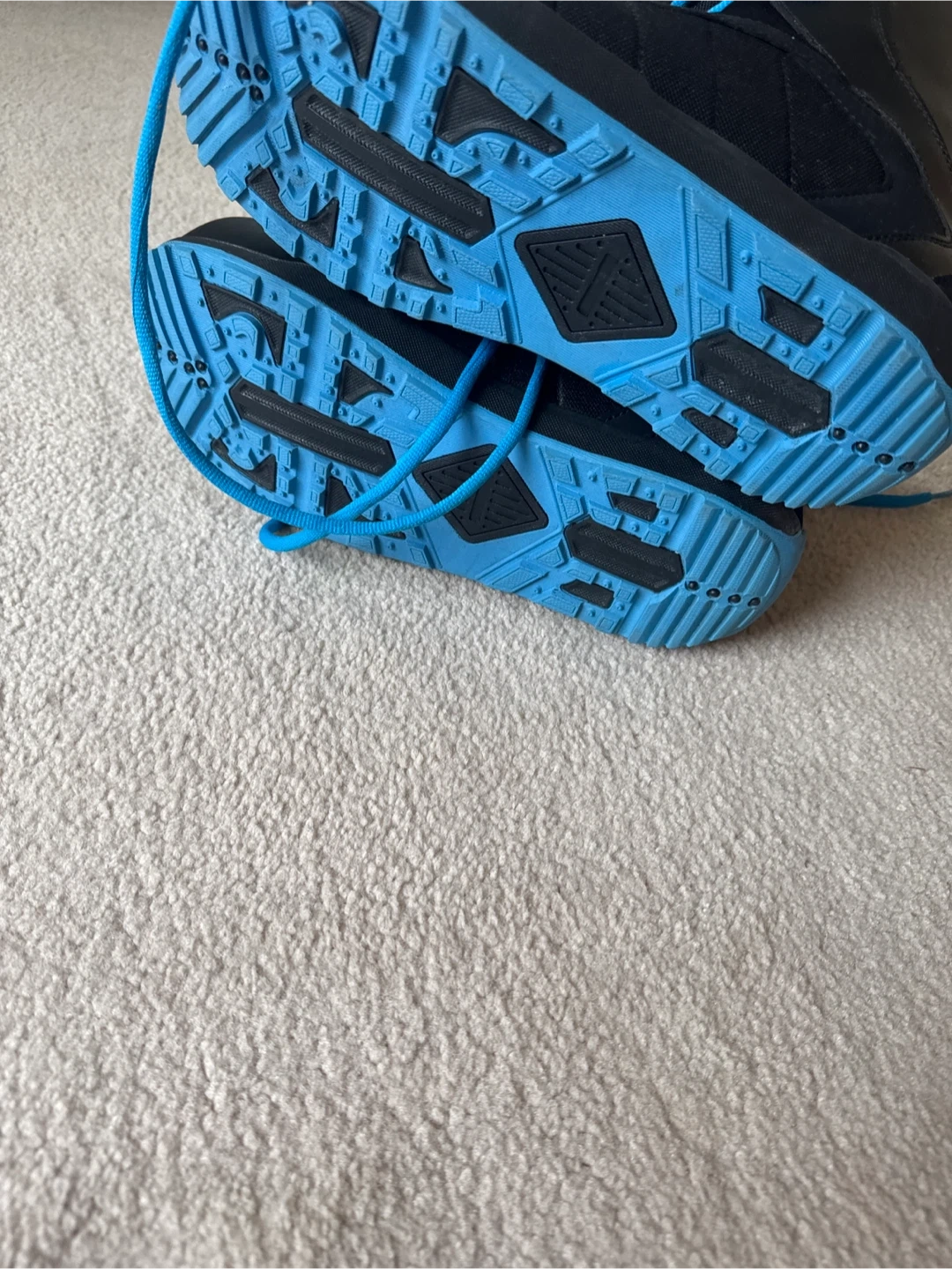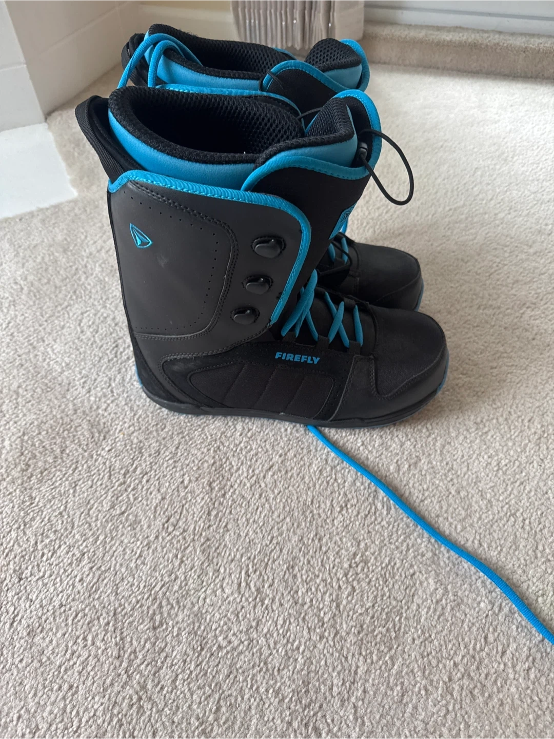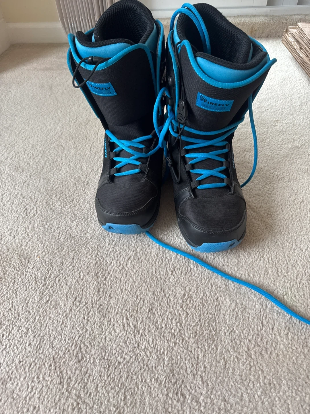 Selling a pair of Firefly snowboard boots in black and blue. They're in great shape and ready for the slopes!