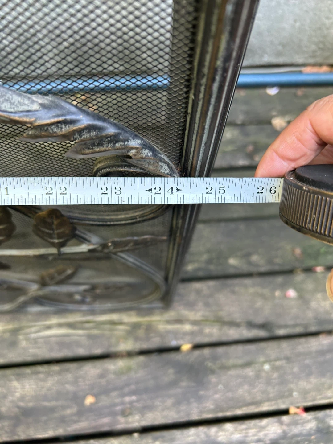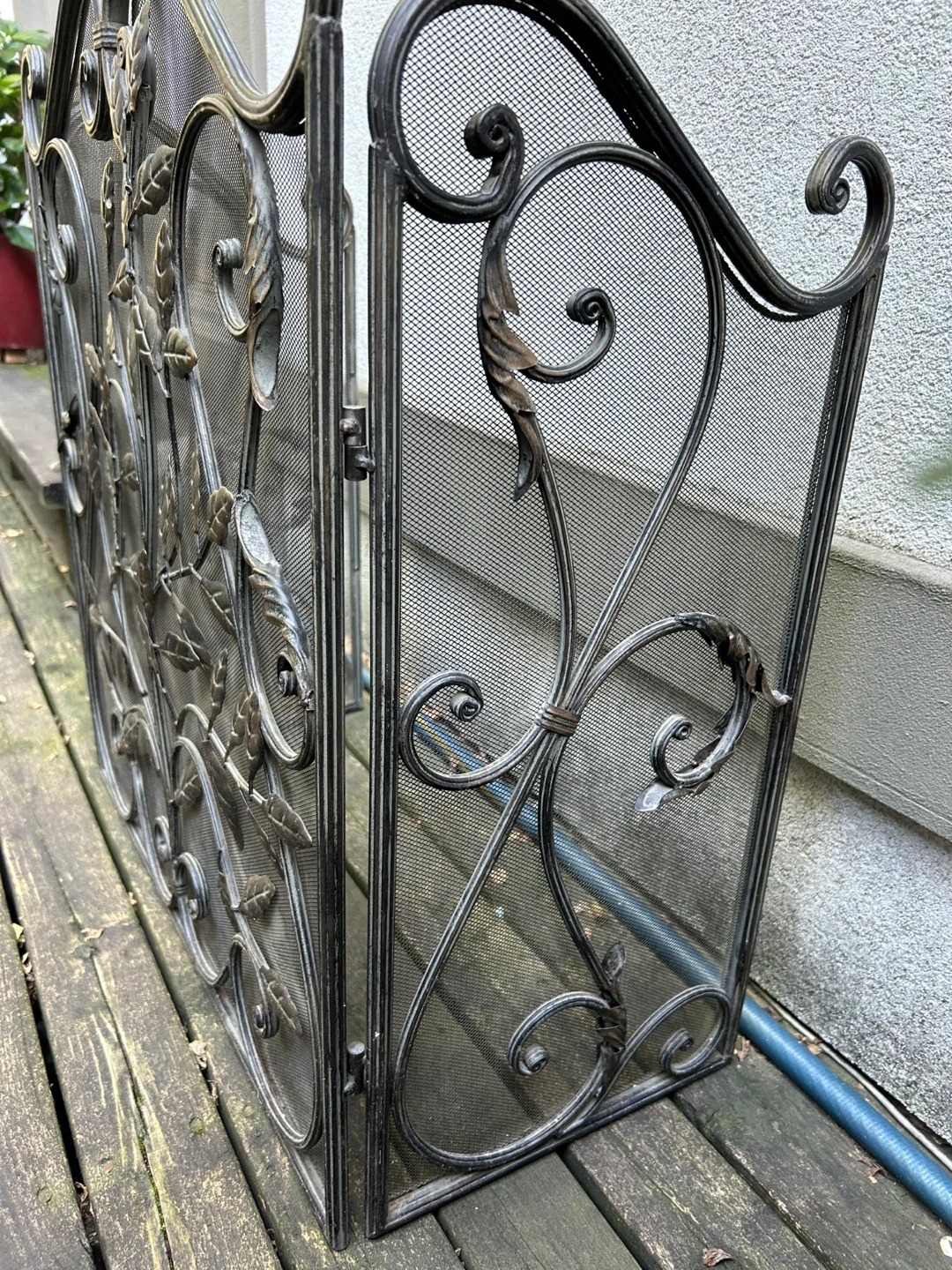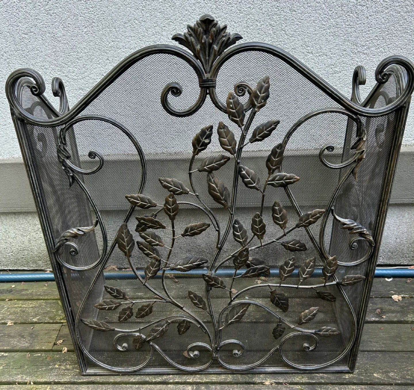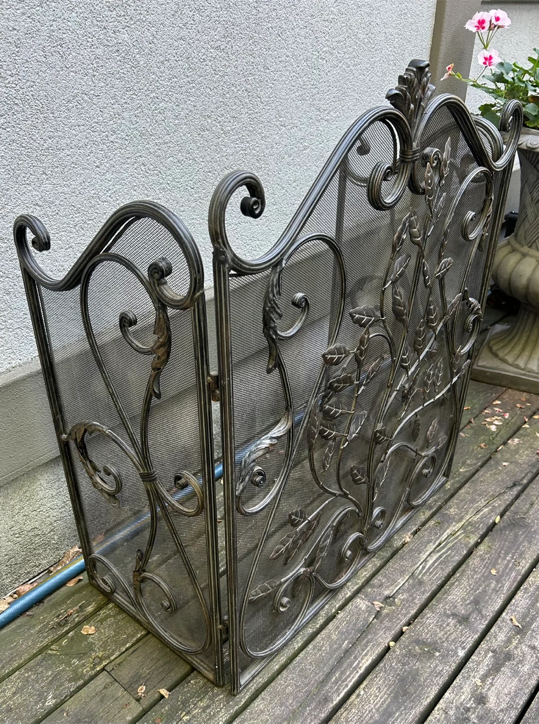 fireplace screen Decorative arched three panel fire place Metal flowers unique Donlands O'Connor Wonderful metal - not brass - 3 panel folding fireplace fire place screen Small footprint when folded flat and still beautiful to display the front and easy to store off season 25 inches wide x 12 deep x 30 inches tall See also the wrought iron fireplace grate and the black fireplace tools I'm selling now as well in separate sales 85.00 Flexible re pickup Elmsdale Road M4J 3M3 Donlands O'Connor East York Don Mills south exit off DVP