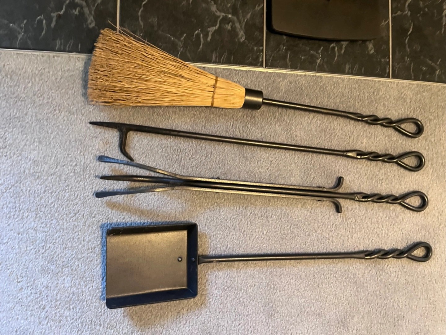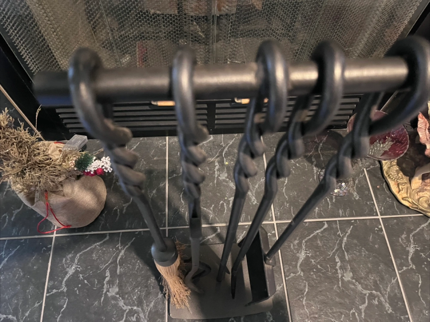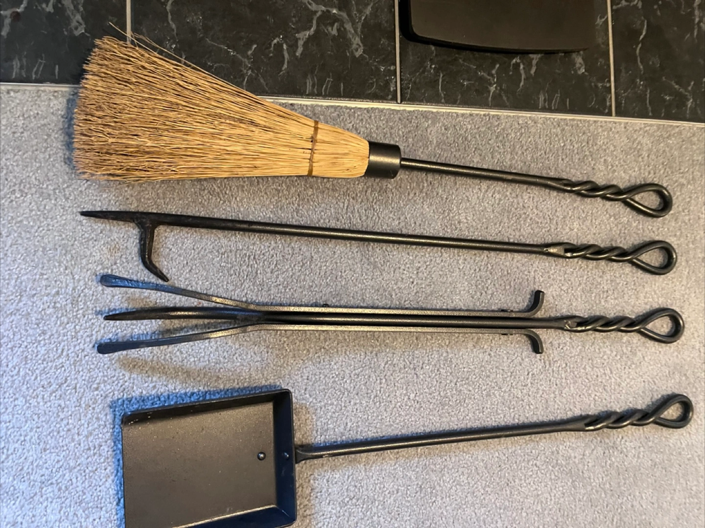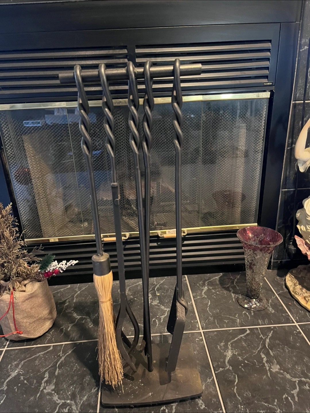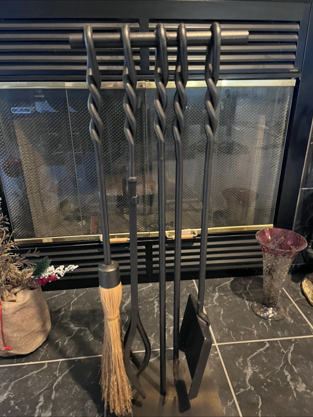 Keep your hearth tidy with this sturdy fireplace tool set! Includes a stand, poker, shovel, tongs, and brush, all crafted from durable black iron. Perfect for maintaining a cozy and clean fireplace area. Never used. Stayed in storage.