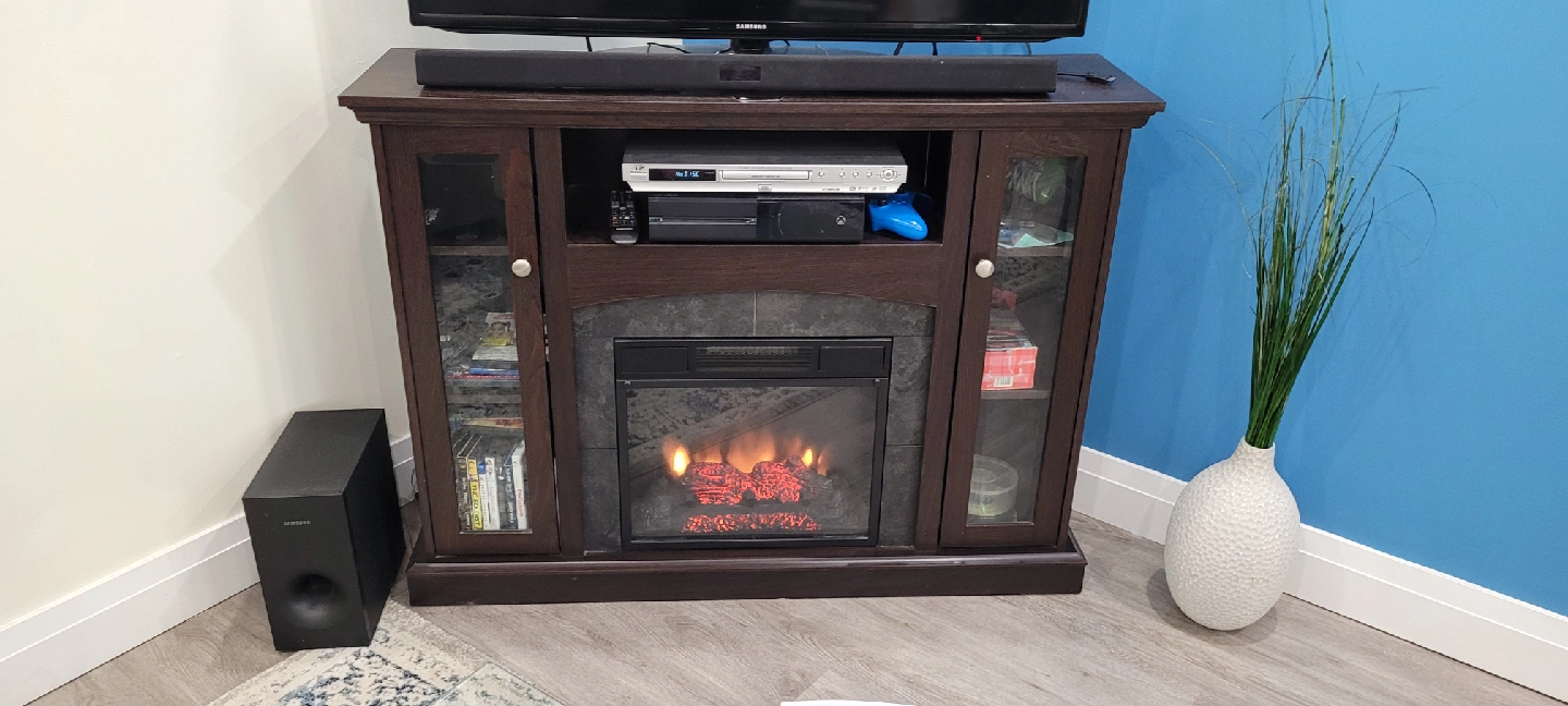 Selling a fireplace TV stand. It's in good condition and has glass doors on either side for storage. There's also space for a DVD player or game console above the fireplace. Perfect for cozying up during the colder months