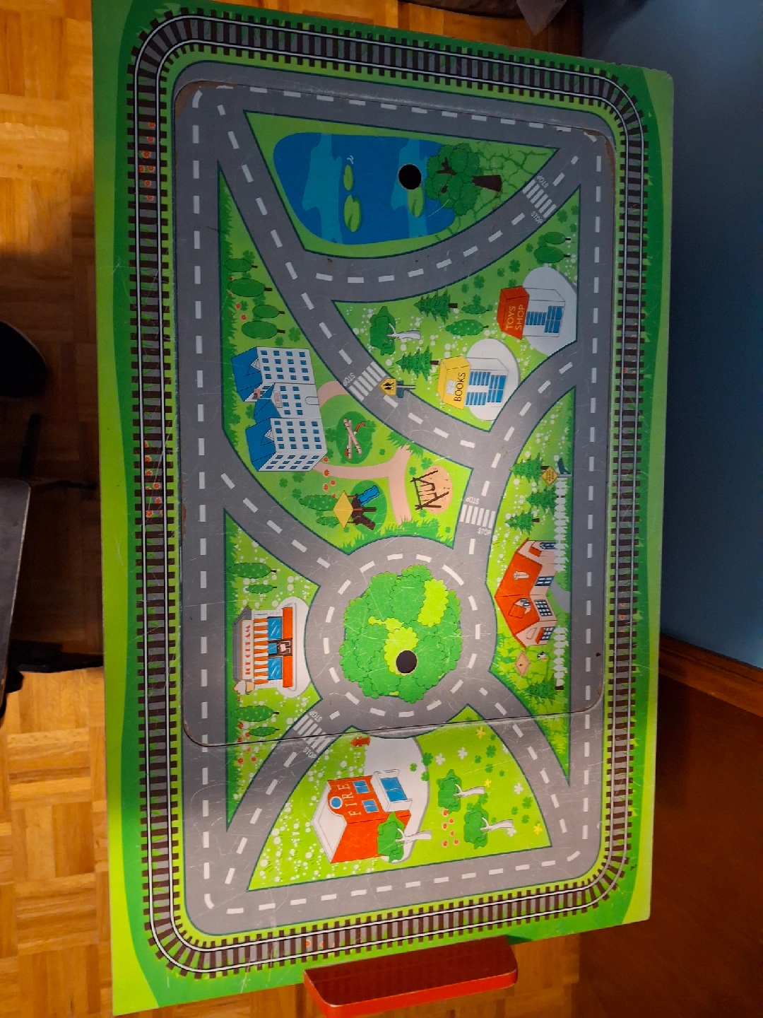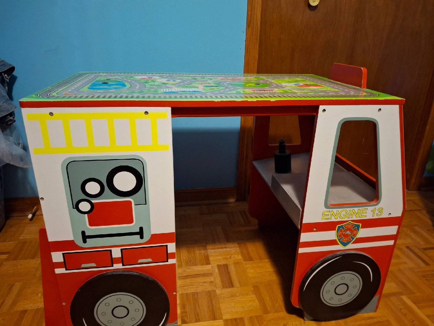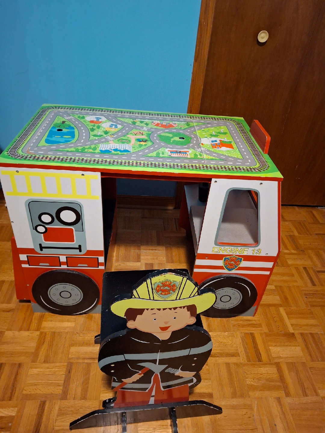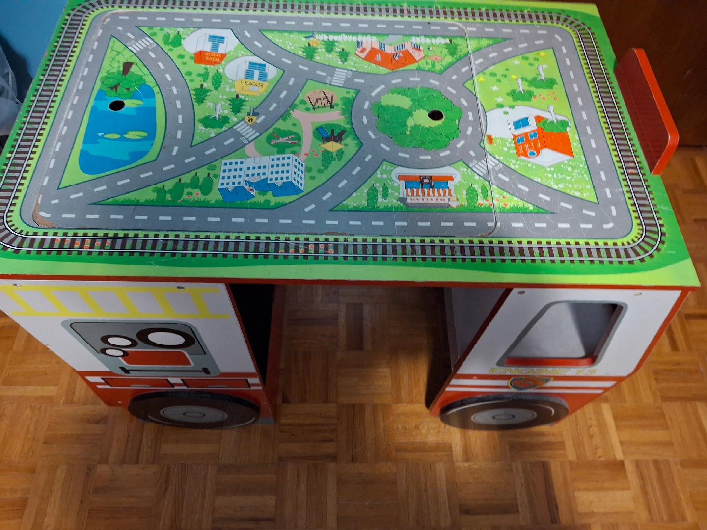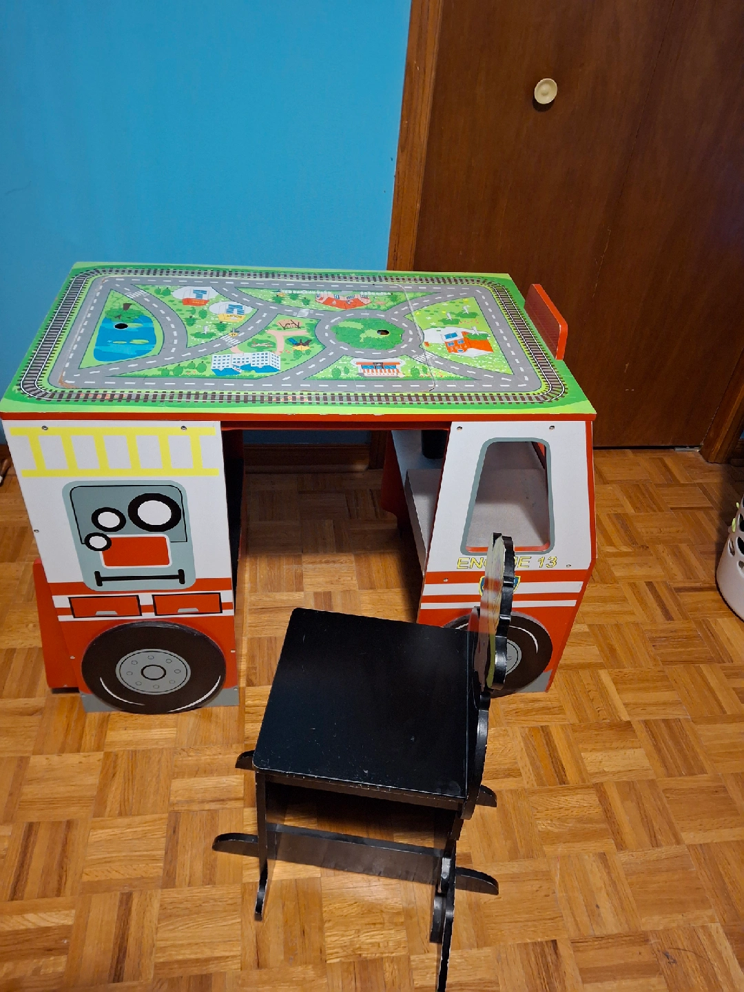A fun activity table shaped like a firetruck! The table top has a road and train track design for hours of play. Comes with a small chair that fits perfectly with the table. Great for kids!