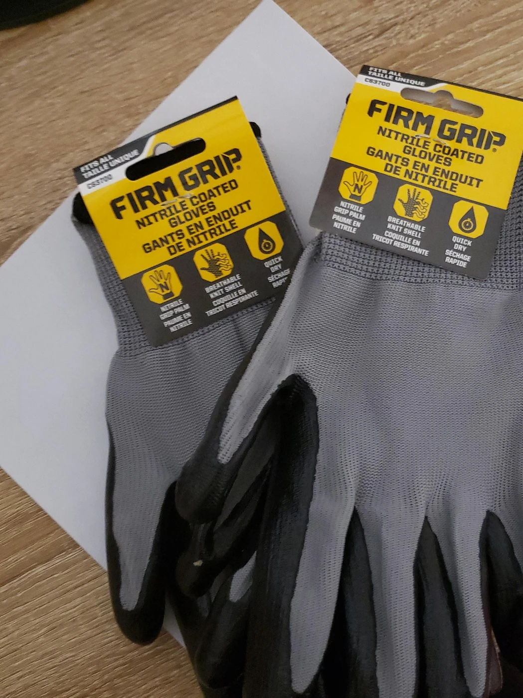 Selling a pair of Firm Grip nitrile coated gloves. They feature a nitrile grip palm and a breathable knit shell. They are designed for quick drying