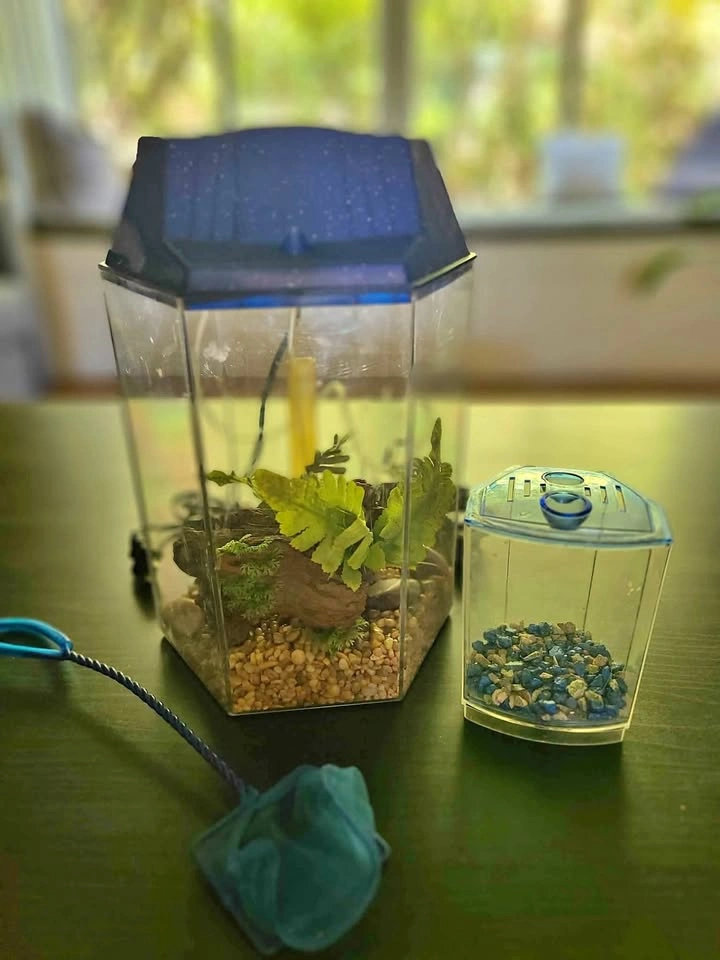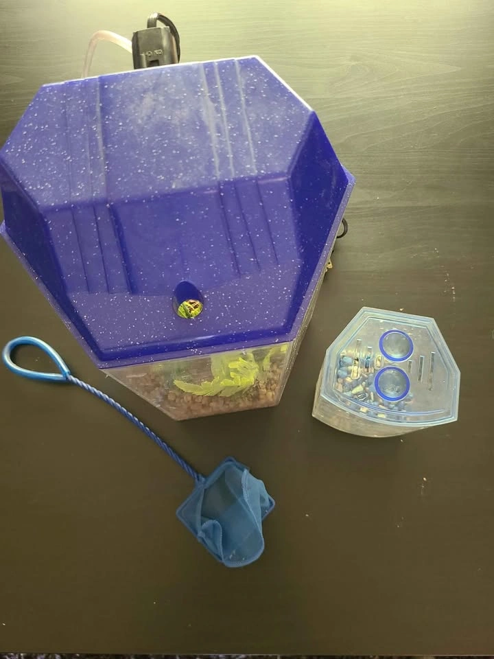 Hexagon shaped fish tank 13in high x 9in wide, complete with rocks, fake plants and log, lightbulb, air filter. Includes fish net and mini (5in x 4in) fish tank with rocks. Pick up near Lou's Grill in Abbotsford.
