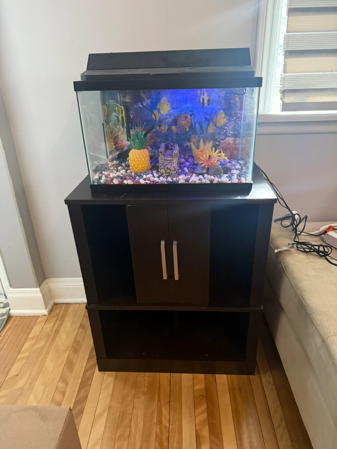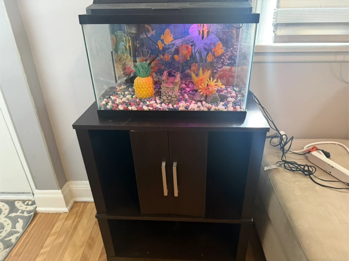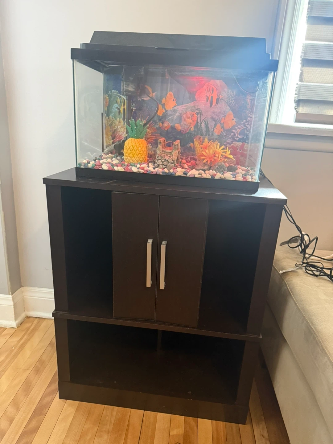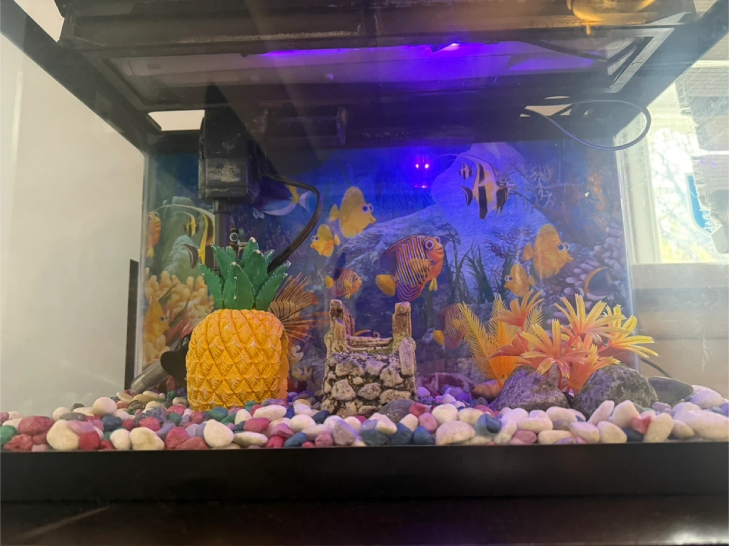 Selling a complete fish tank setup! It comes with a sturdy stand, a variety of colourful decorations, and a filter to keep the water clean. Perfect for anyone looking to start their own aquarium or upgrade their current one. The tank is in good condition and ready to go!