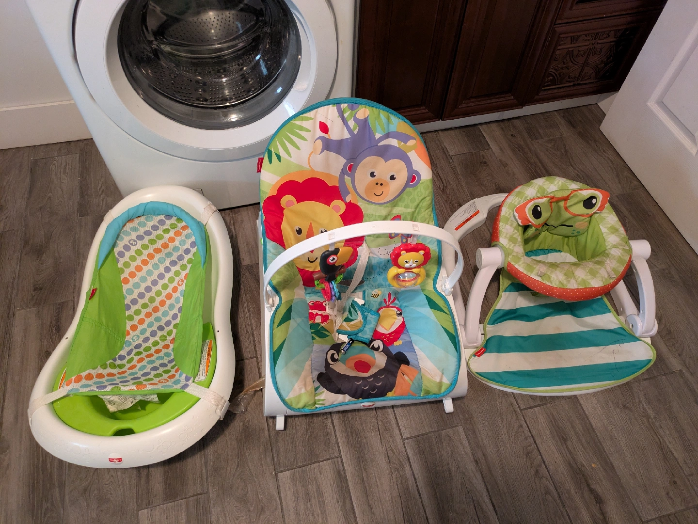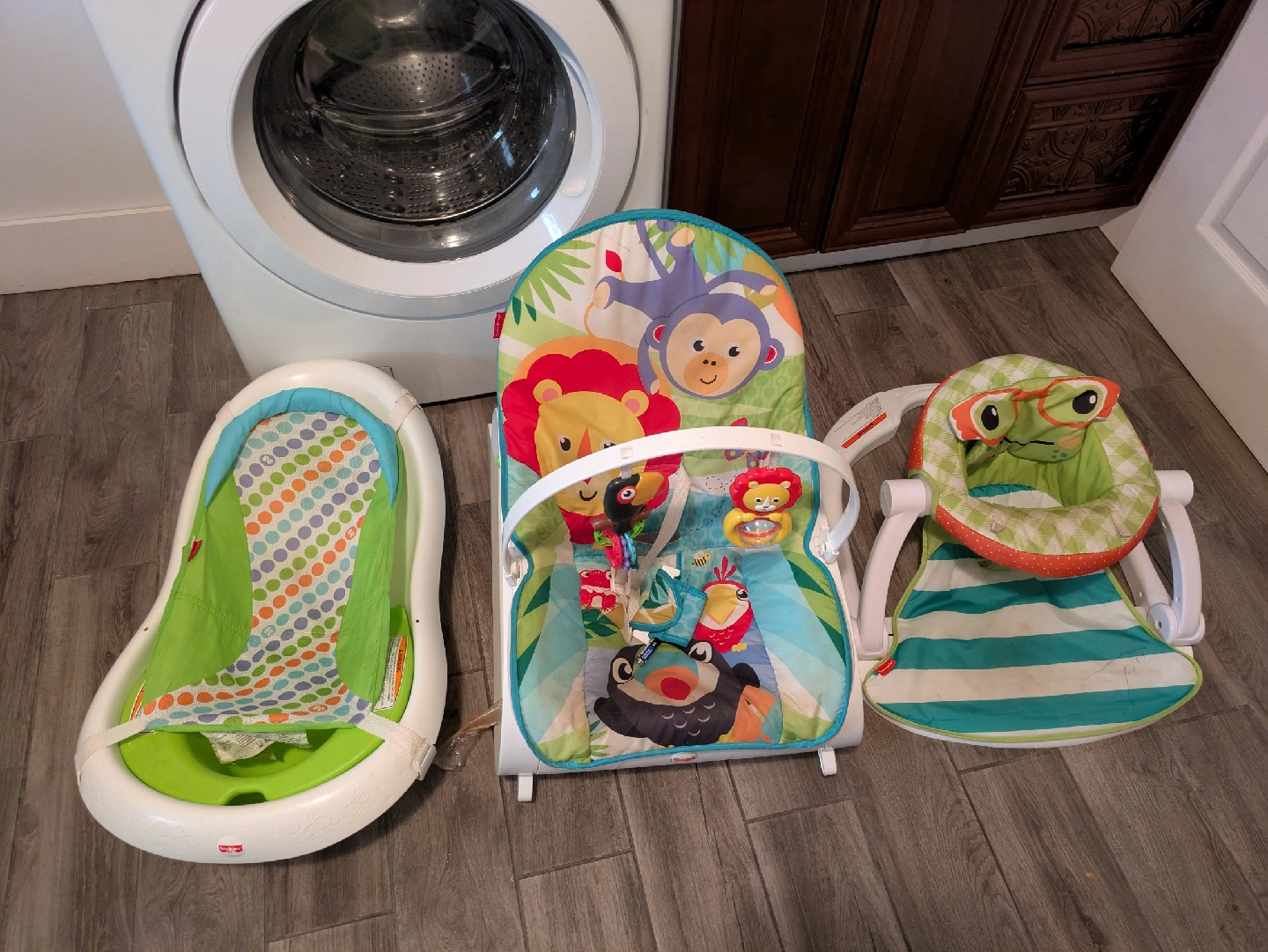 Selling a bundle of Fisher-Price baby items! This includes a baby bath with slings, a sit up chair and a bouncer. All in good condition and ready for a new home. Perfect for infants!