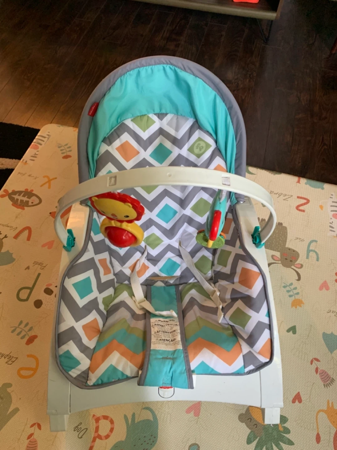 Selling a gently used Fisher-Price baby bouncer seat! It's in great shape and ready for a new little one. The seat features a fun, colourful design and hanging toys to keep your baby entertained. Perfect for soothing and playtime!