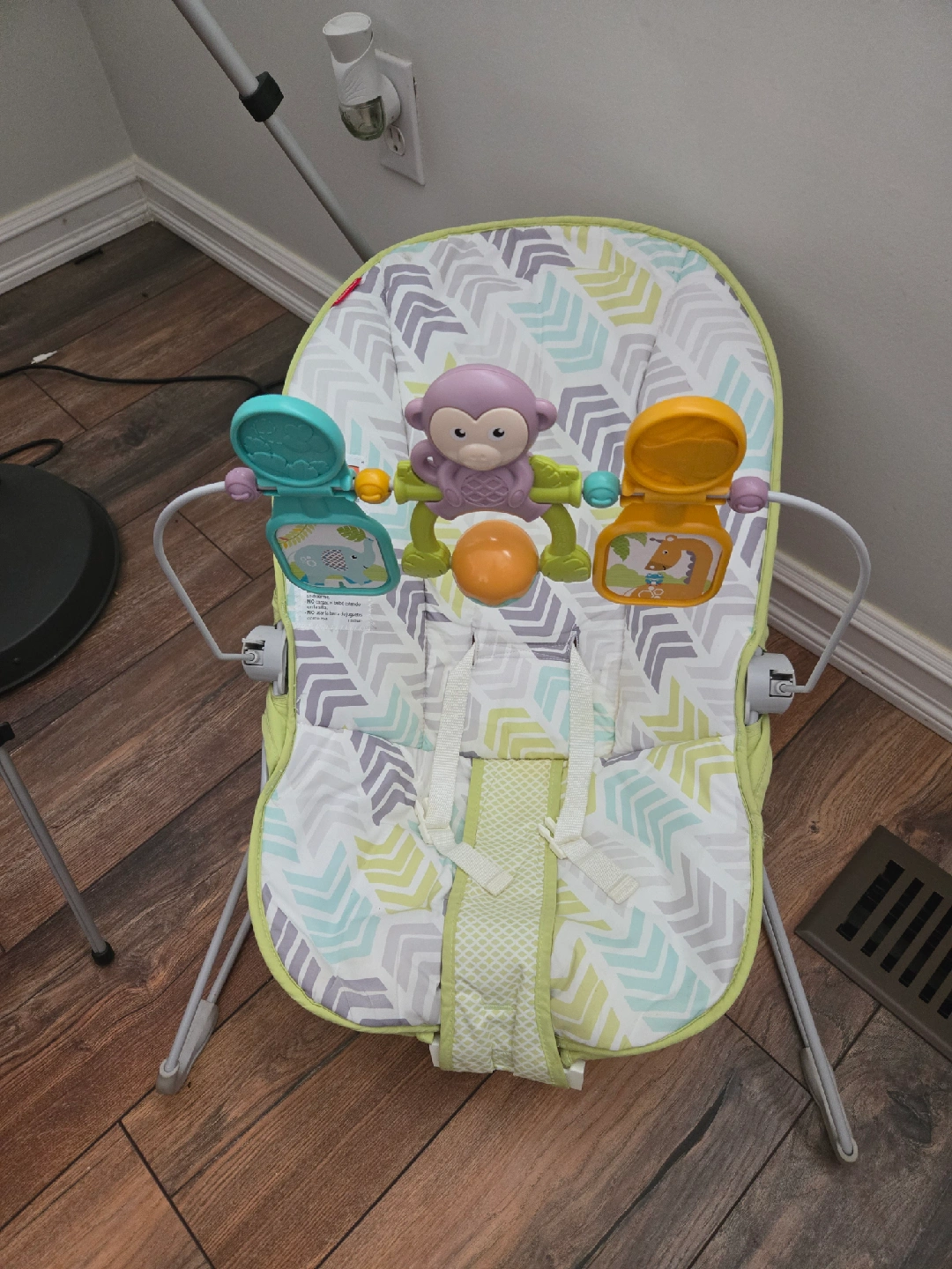 Selling a gently used Fisher-Price baby bouncer. It's in great condition and features a cute monkey toy bar with interactive toys to keep your little one entertained. Perfect for newborns and up!