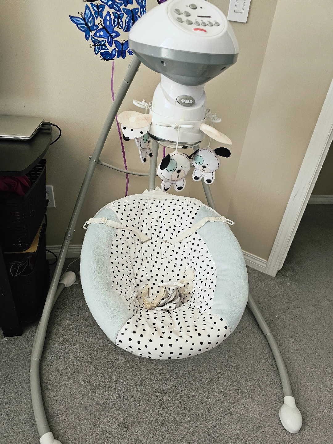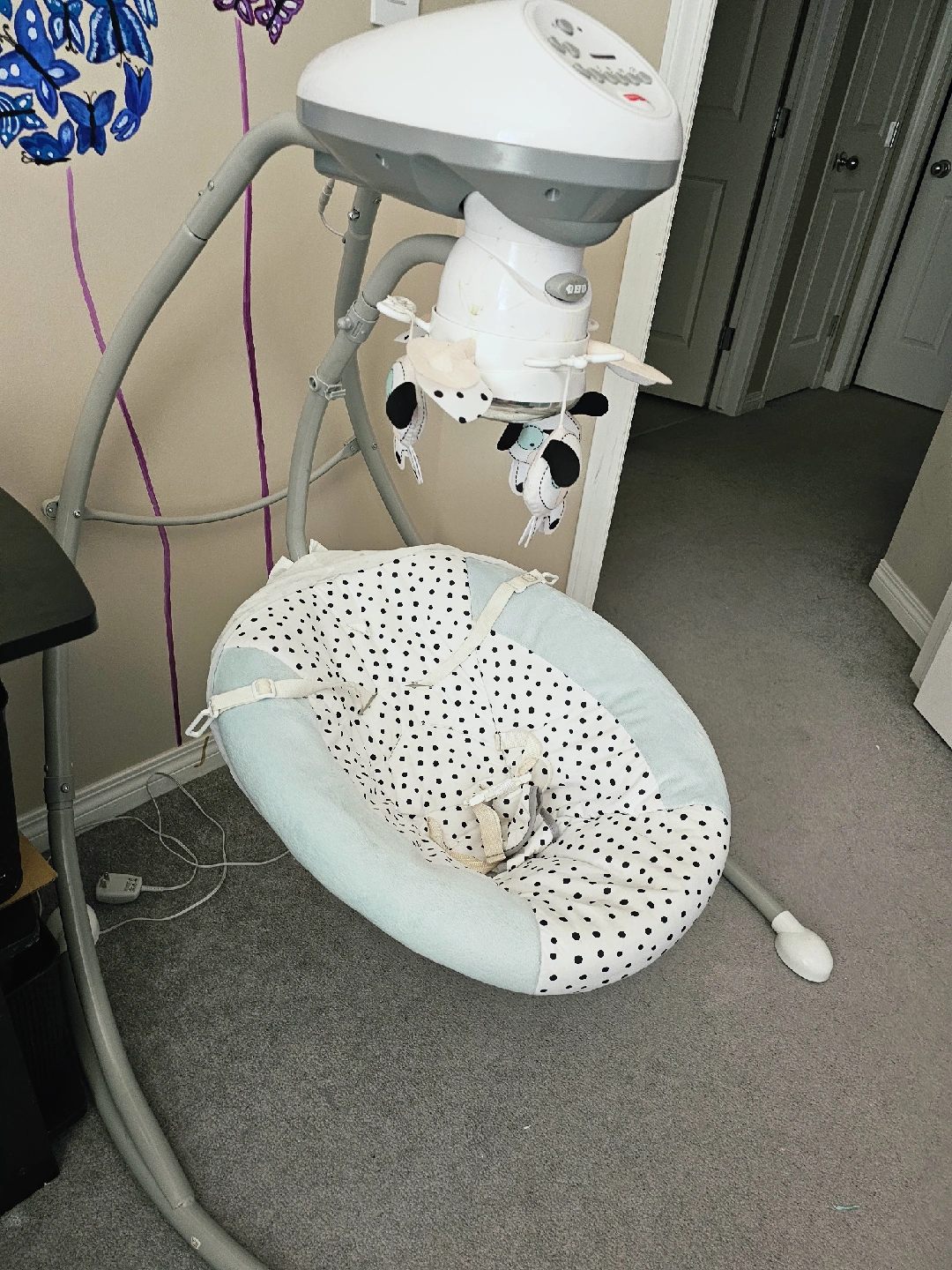 Selling a gently used baby swing! It's in great condition and ready for a new home. This swing has a comfy seat and cute mobile to keep your little one entertained. Perfect for soothing and relaxing your baby!