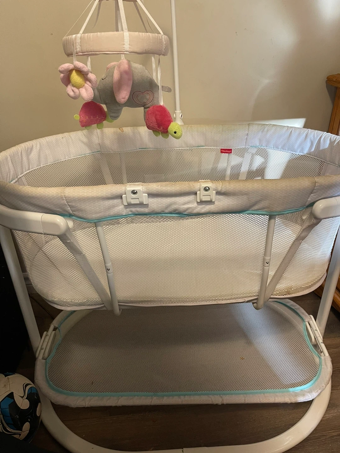 Selling a Fisher-Price Bassinet. It's in good used condition and ready for a new little one. The bassinet features a calming mobile to help your baby drift off to sleep. Perfect for newborns!