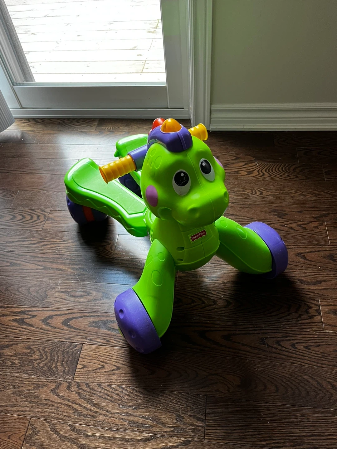 Selling a gently used Fisher-Price dinosaur ride-on toy! It's in great shape and ready for a new home. This fun green and purple ride-on toy is perfect for toddlers who love dinosaurs and active play. Hours of fun! Needs batteries.