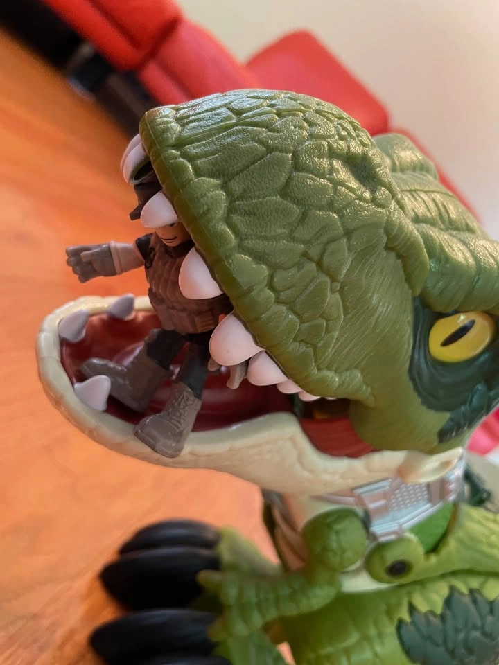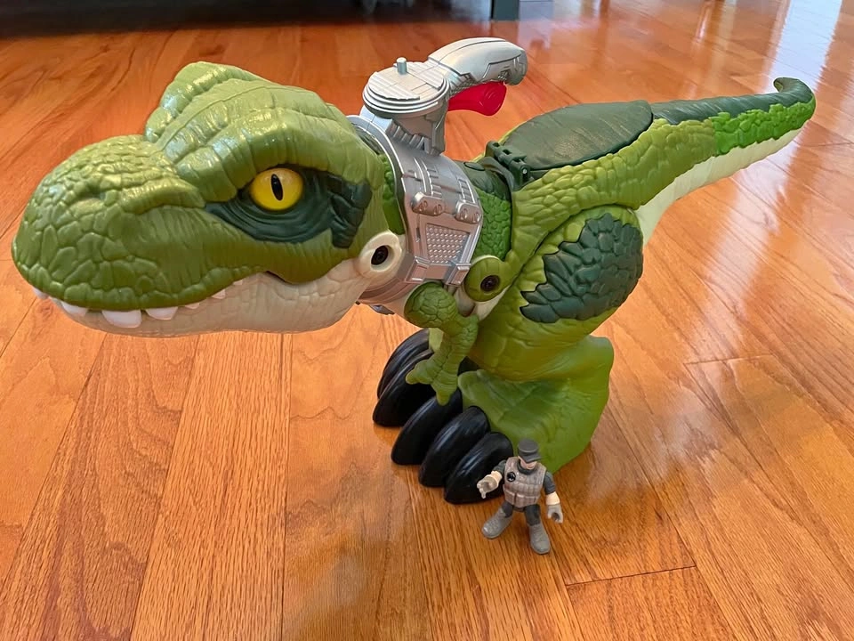 Create exciting Jurassic World adventures with this giant chomping T. rex dinosaur! - Lunge the T. rex forward, chomp the figure, and swallow him down to her belly! Handle moves the dino’s head & neck; squeeze the trigger for chomping action - Open the door on dinosaur ’s back to retrieve the figure & start the action again Like new. Comes with action figure. GREAT cool dino toy for toddlers. Chunky, no sharp edges, easy to use chomping handle. $35 (retail over $85 plus tax) Pick-up in Oakville. Just north of the QEW off Bronte.