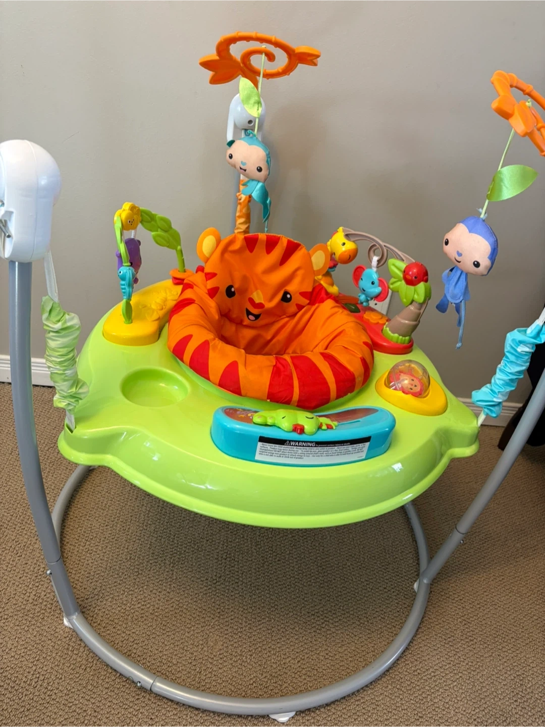 This Fisher Price Jump & Learn jumper is in great shape! It's perfect for keeping your little one entertained and active. It features a variety of toys and activities to stimulate their senses and help them develop important motor skills. Recommended for ages 4 months to walking age.