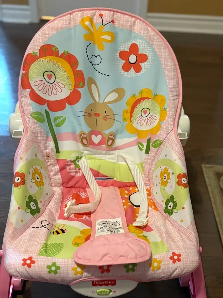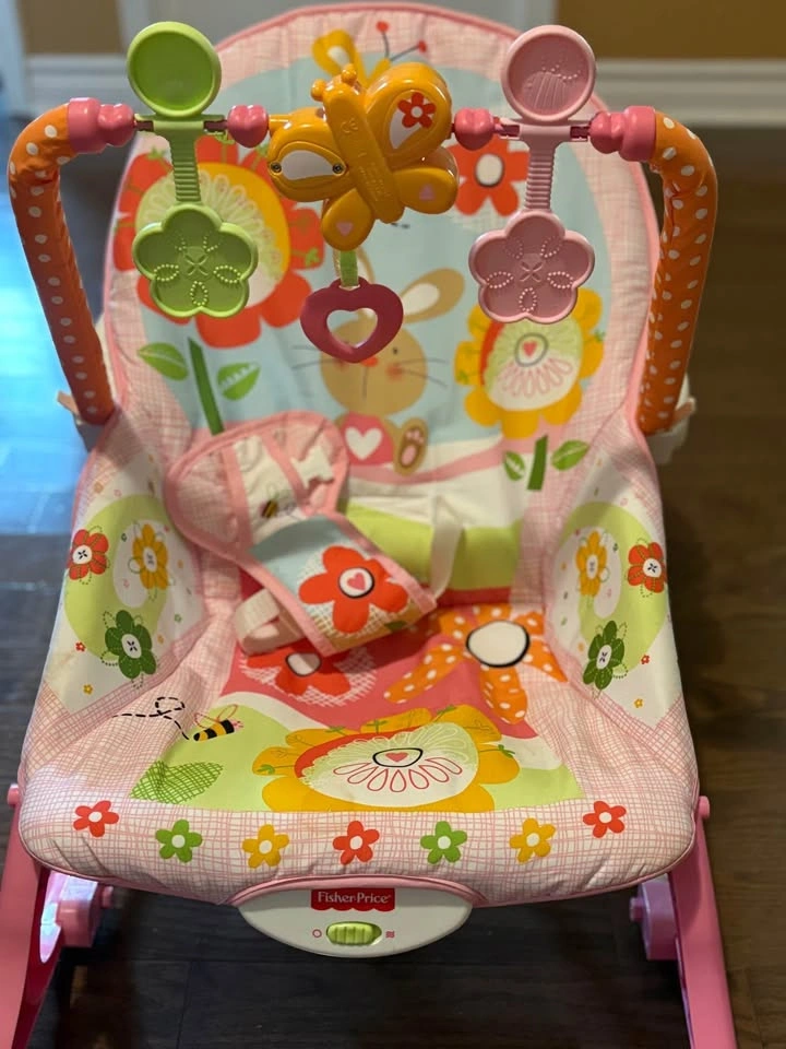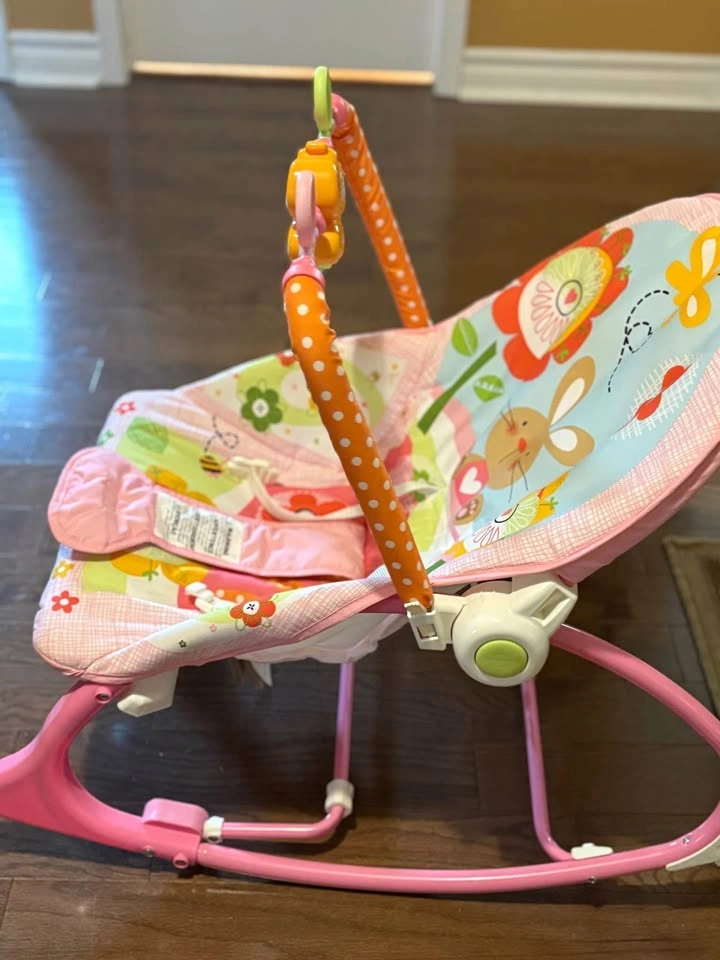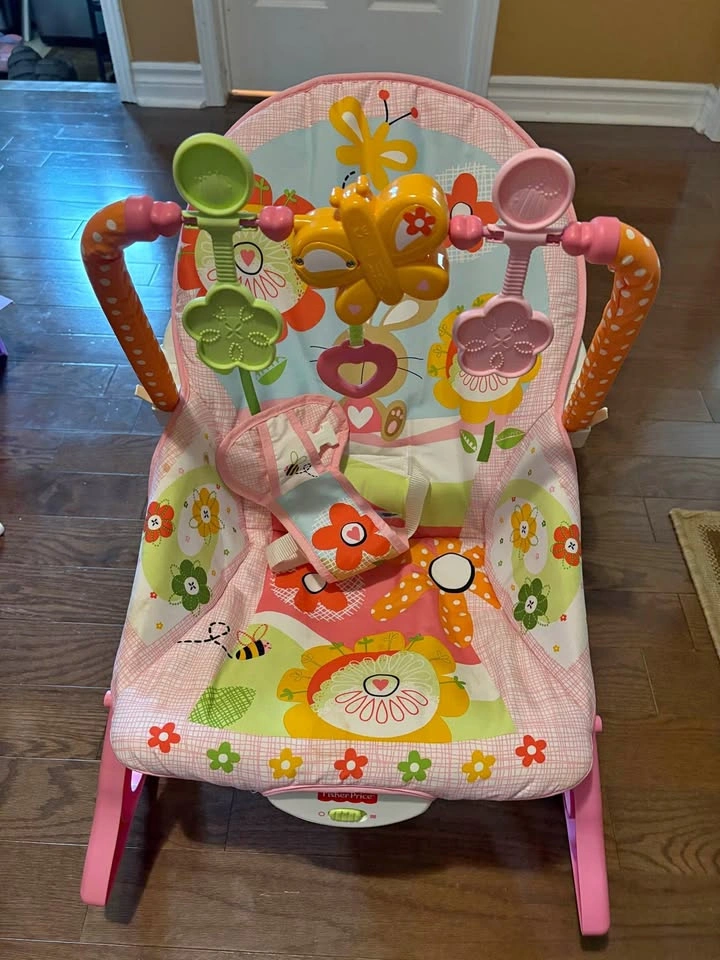 Selling a Fisher-Price Newborn-to-Toddler Rocker. It's in excellent condition and ready for a new home! Features a colourful design and toy bar to keep your little one entertained (removable). Perfect for newborns (use recline mode) up to toddlers (recline or upright mode) Vibrates, and has music. Can be used stationary or can flip out legs to stabilize. The rocker easily converts from a newborn rocker to a toddler seat. It has a secure three-point restraint and a lightweight design, making it easy to move around the house. Features vibration /music with an easy on and off switch. Cash only-local pick up in Richmond hill area (Manual available)