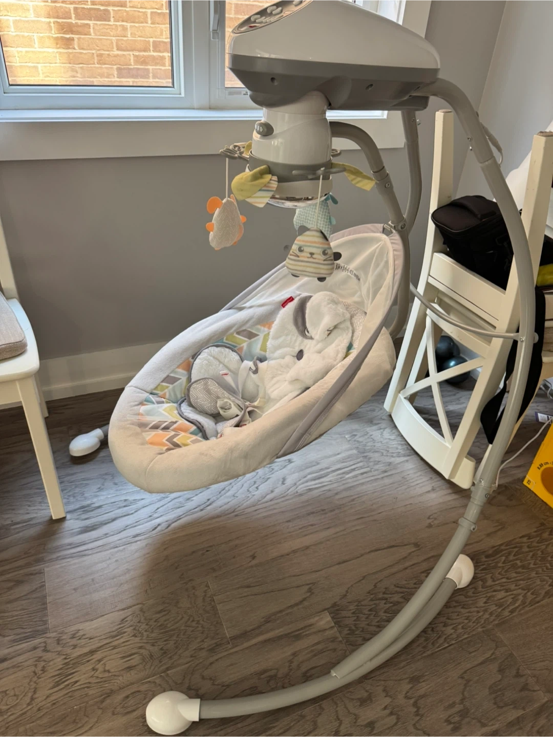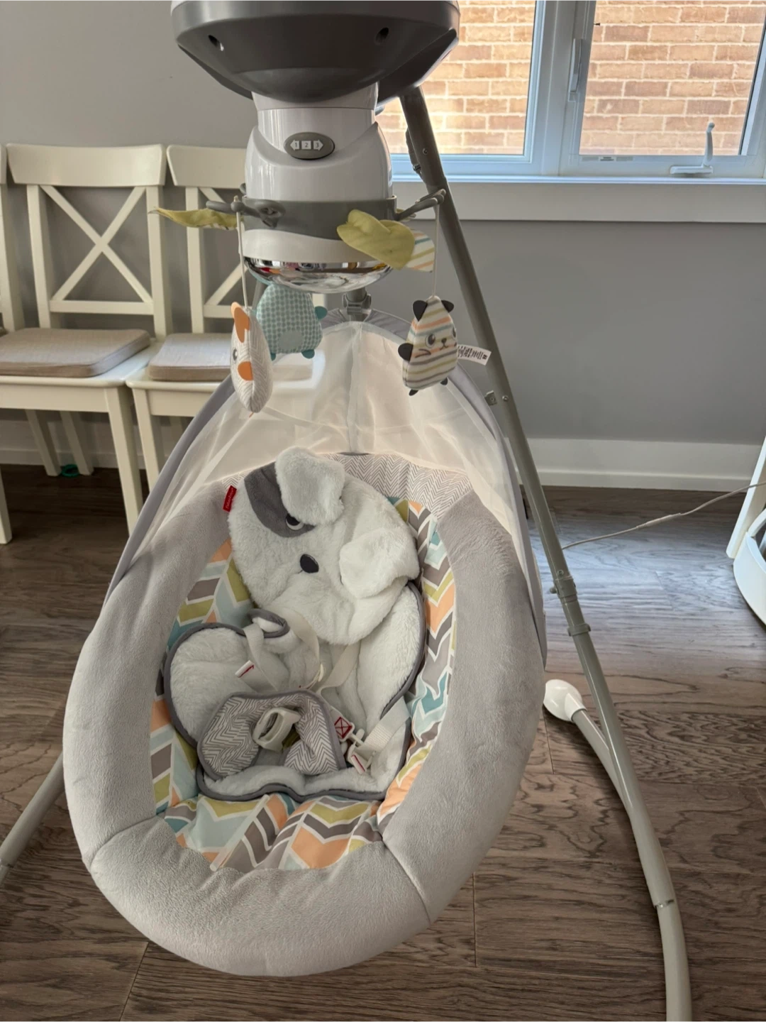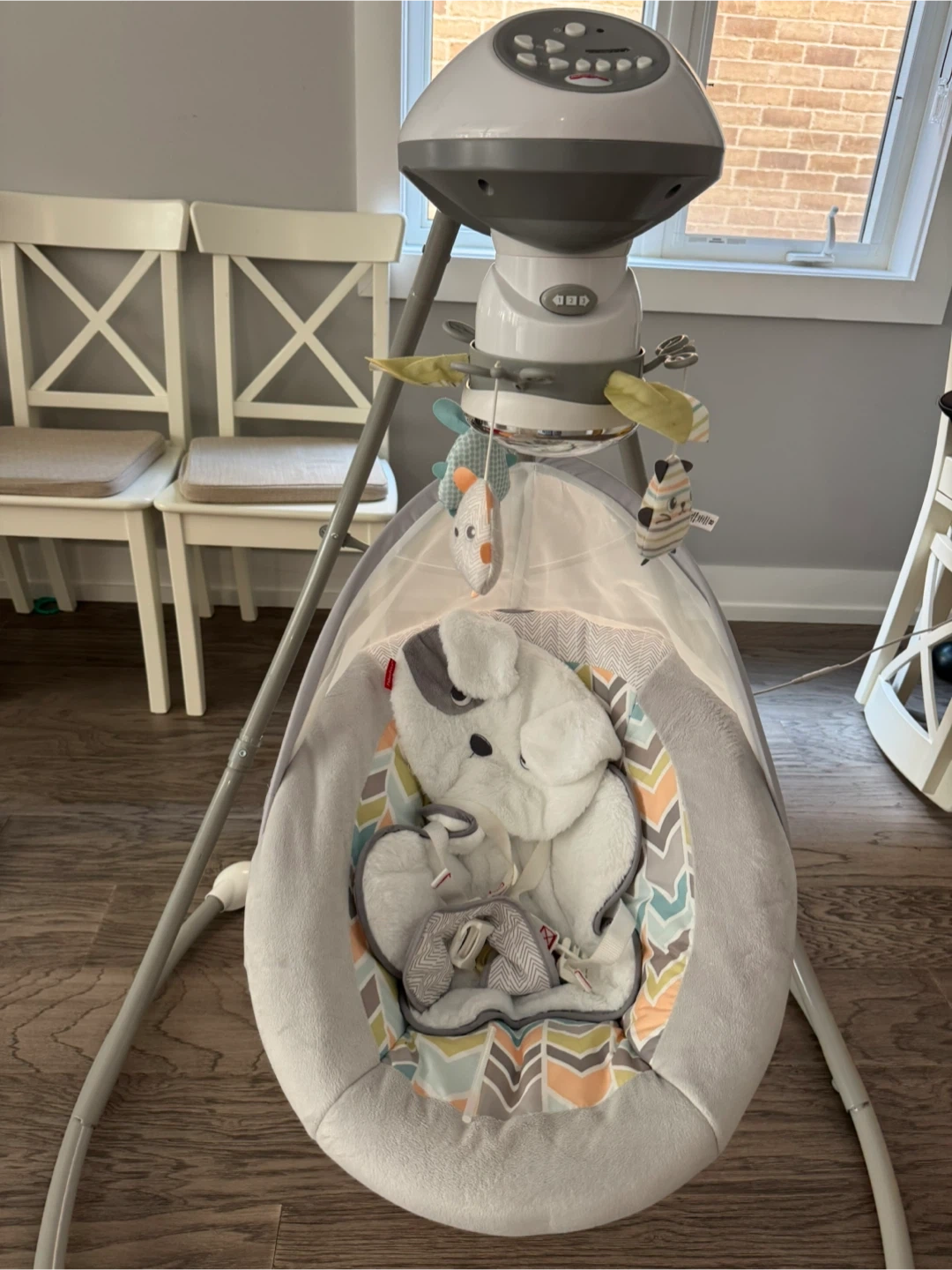Selling a Fisher-Price Snugapuppy Cradle 'n Swing! It's in great condition and ready for a new home. This swing offers a cozy and soothing experience for your little one with its gentle motions and plush Snugapuppy seat. It's perfect for keeping your baby calm and entertained!