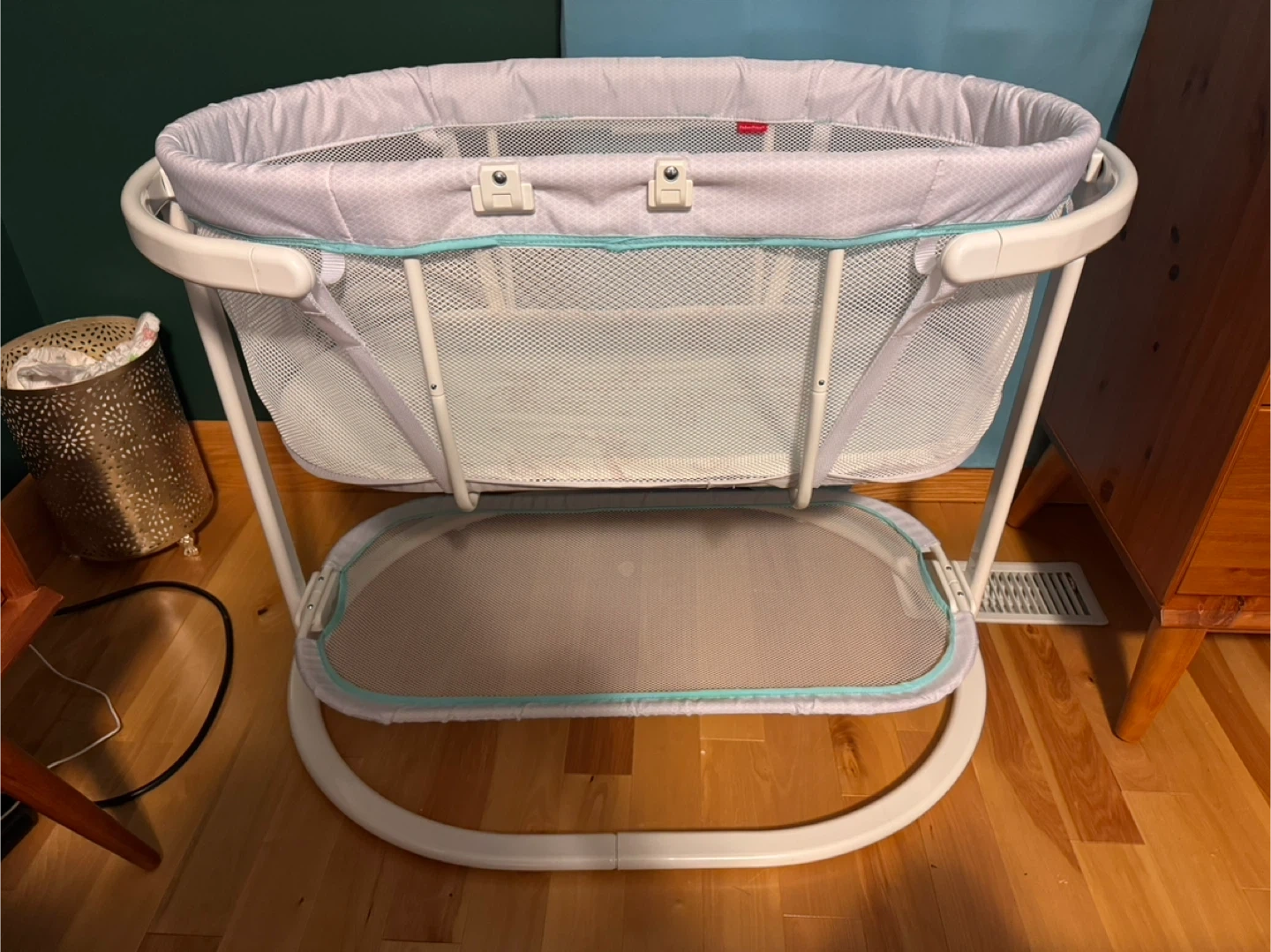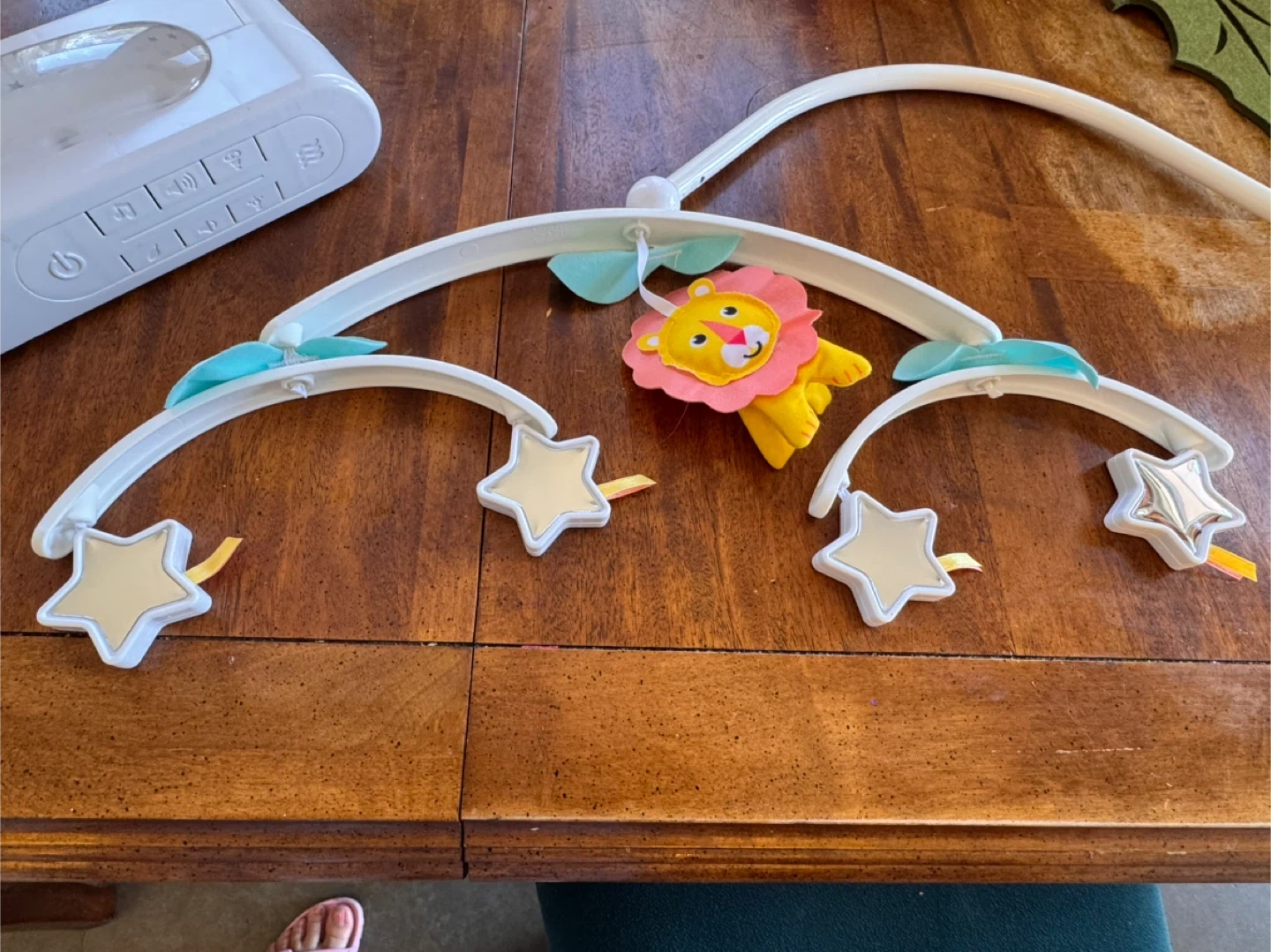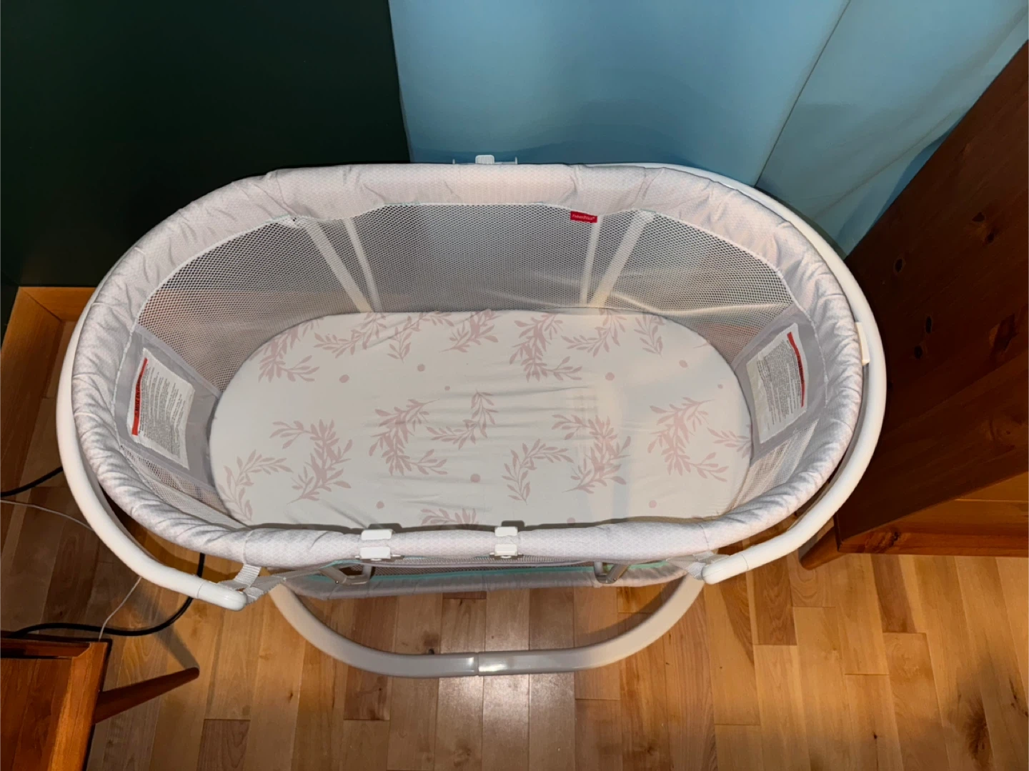 Selling a Fisher-Price Soothing Motions Bassinet and a baby mobile. The bassinet is perfect for keeping your little one close and comfortable! The mobile features cute stars and a lion, providing visual stimulation for your baby. Great condition- option to play music, lights, or vibration. Comes with two bamboo fitted sheets.