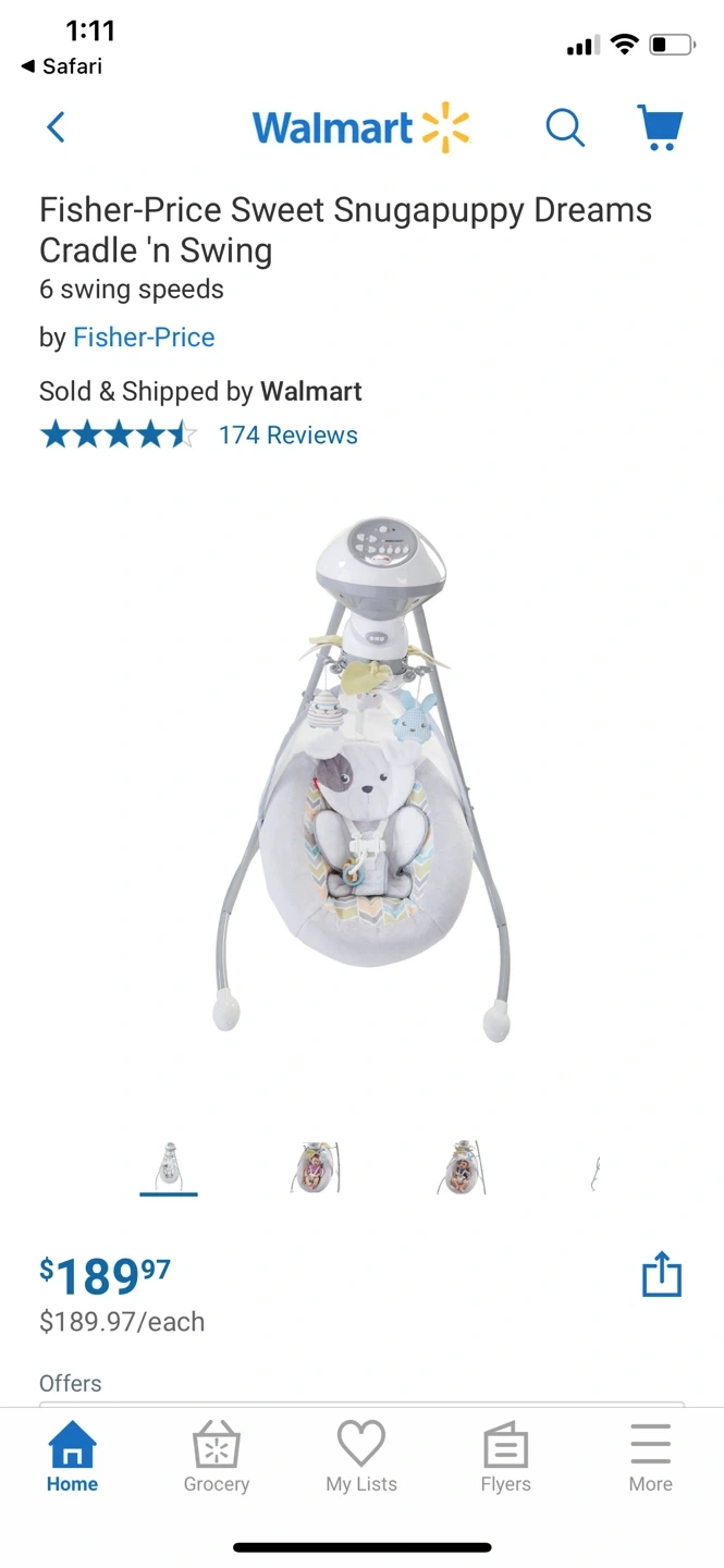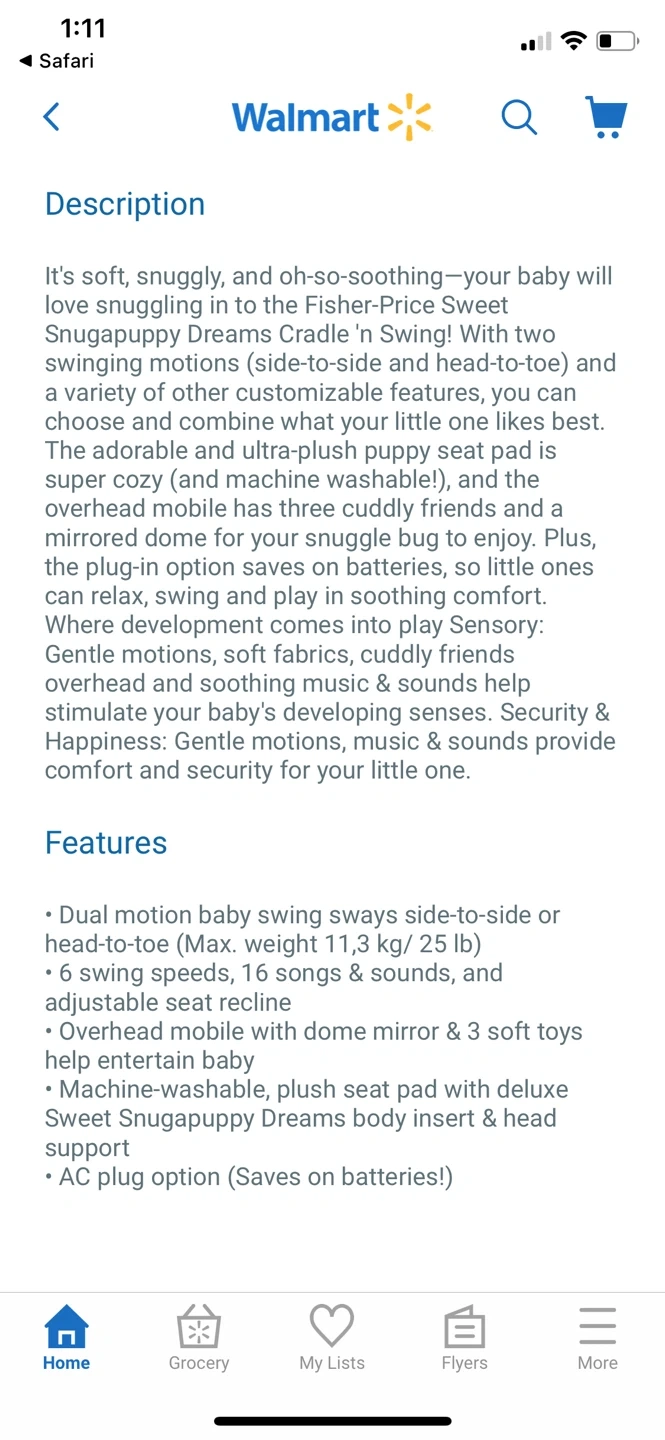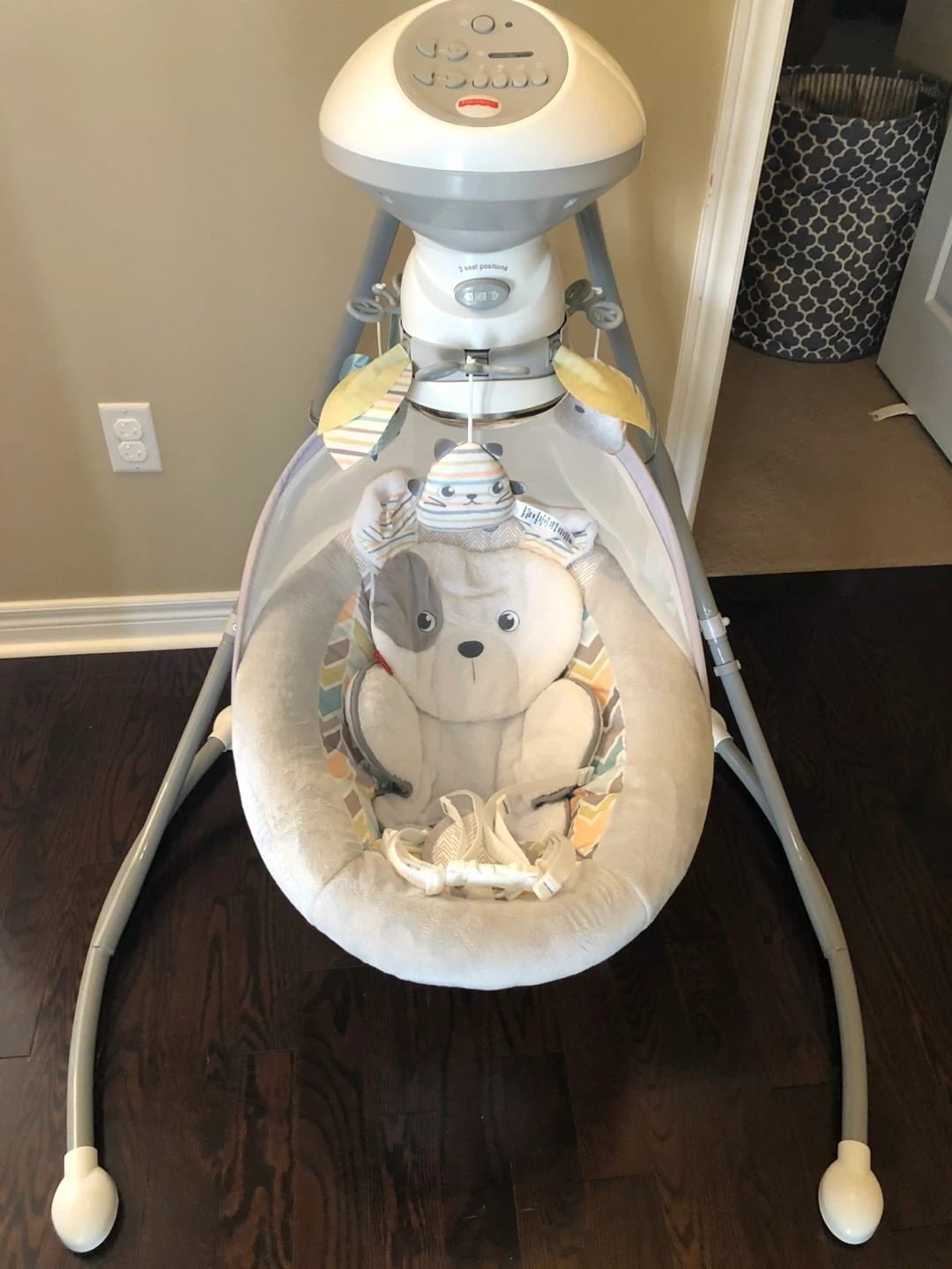 Your little one will love snuggling in this Fisher-Price Sweet Snugapuppy Dreams Cradle 'n Swing! It has two swinging motions (side-to-side and head-to-toe) and a variety of customizable features. The seat pad is super cozy and machine washable. The overhead mobile has three cuddly friends and a mirrored dome for your little one to enjoy. Gentle motions, soft fabrics, and sounds help with development. Originally bought for $189.97.
