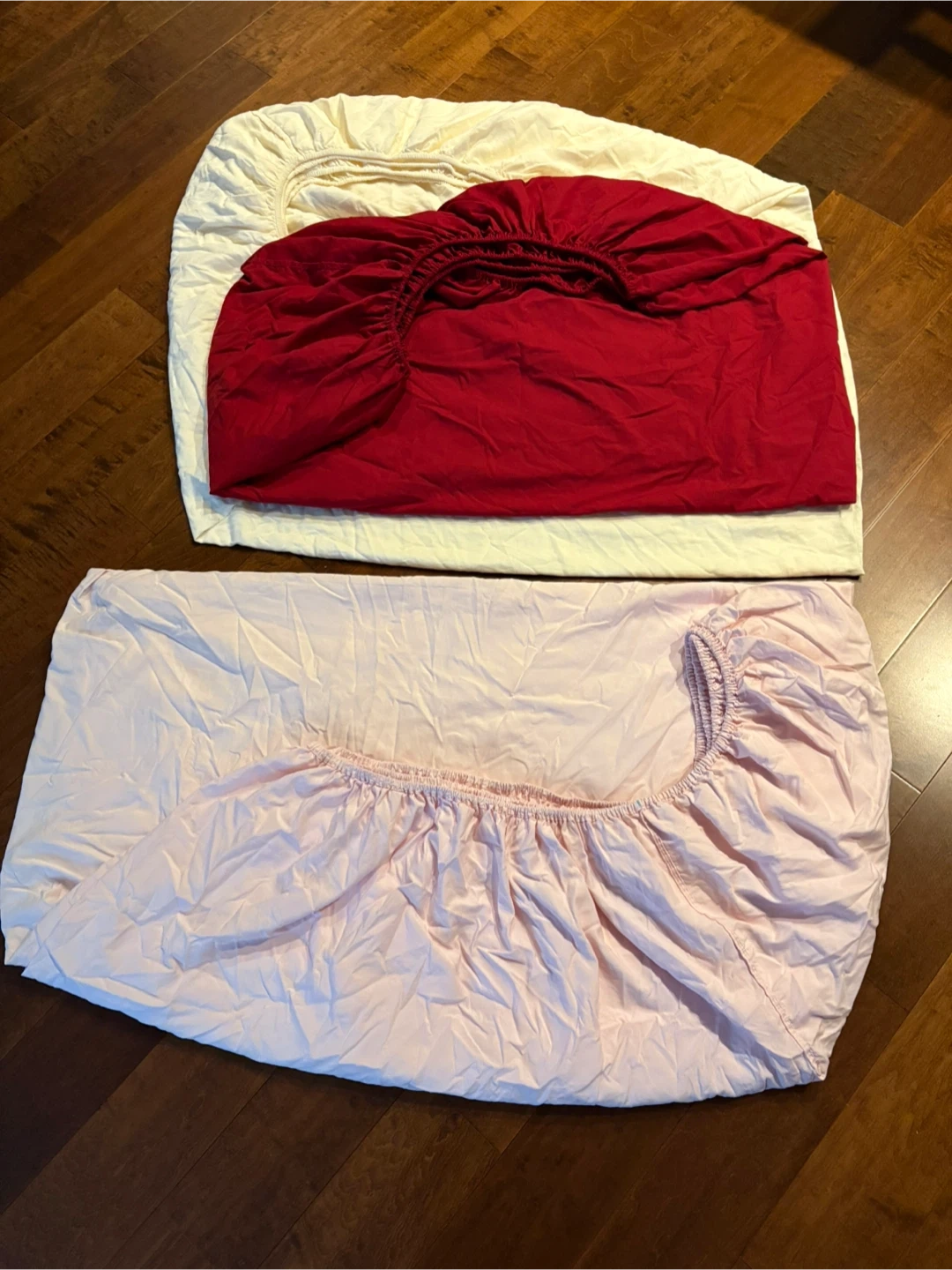 3 = $15. Selling a set of fitted bed sheets in three colours: red, cream( twin size) and pink ( full size). They're in good condition and ready for a new home! Perfect for adding a pop of colour to your bedroom or stocking up on essentials Only available for pick up in Langley.
