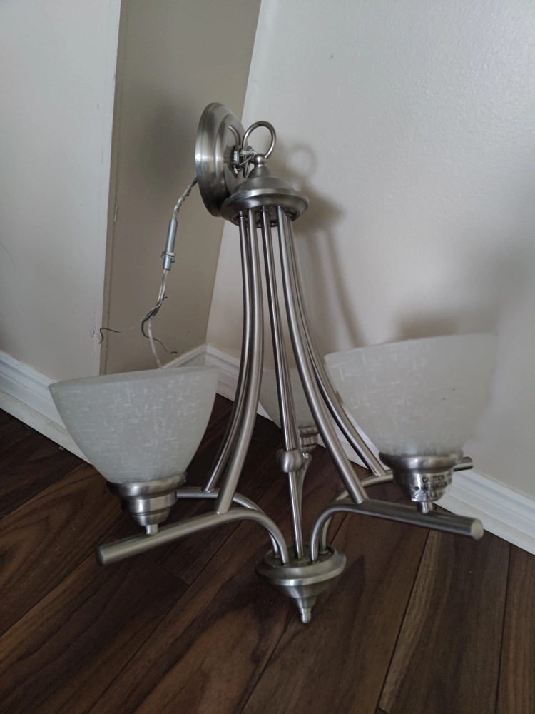 Pre-owned Five-light brushed nickel chandelier with Frosted glass shades.