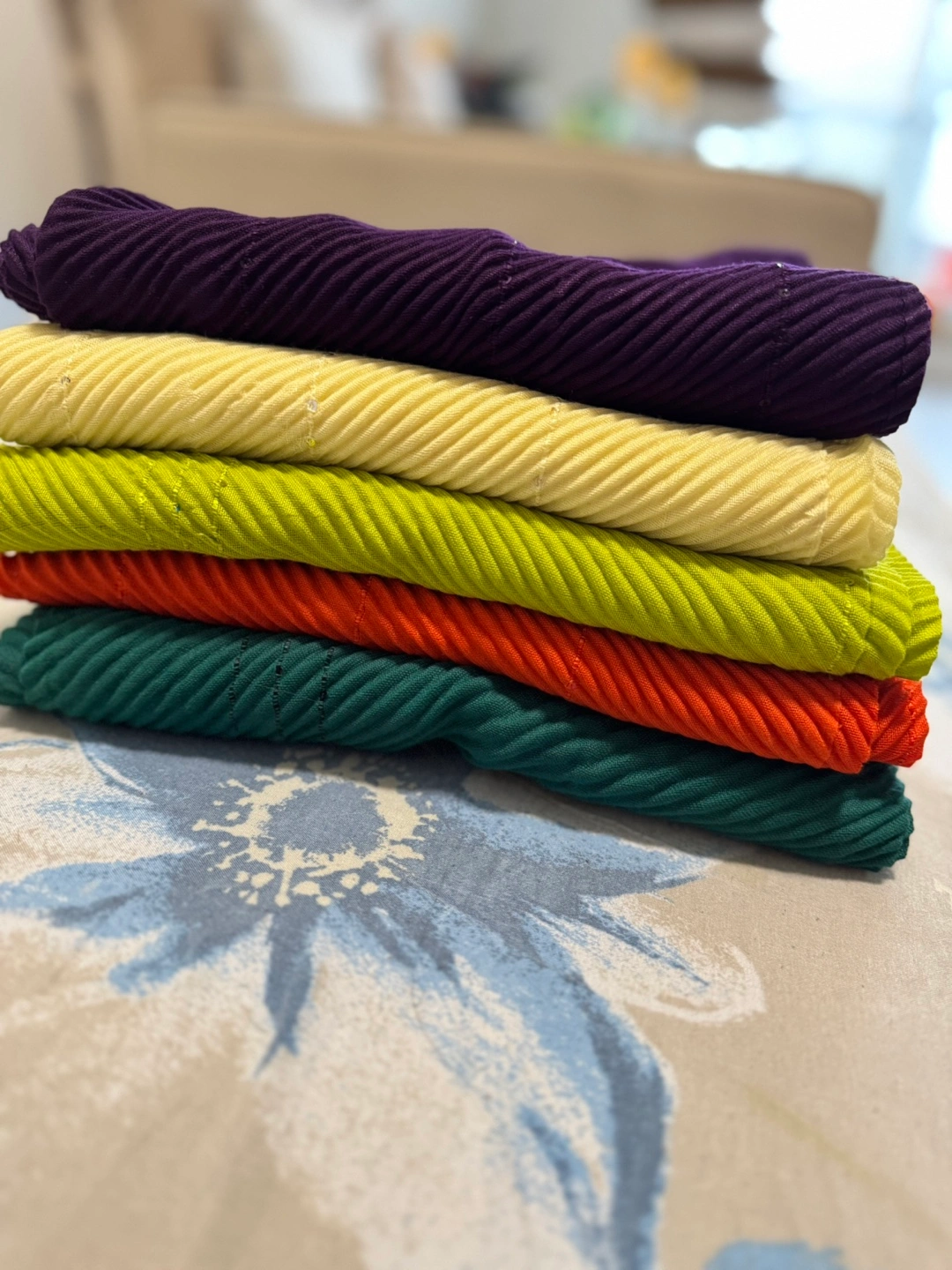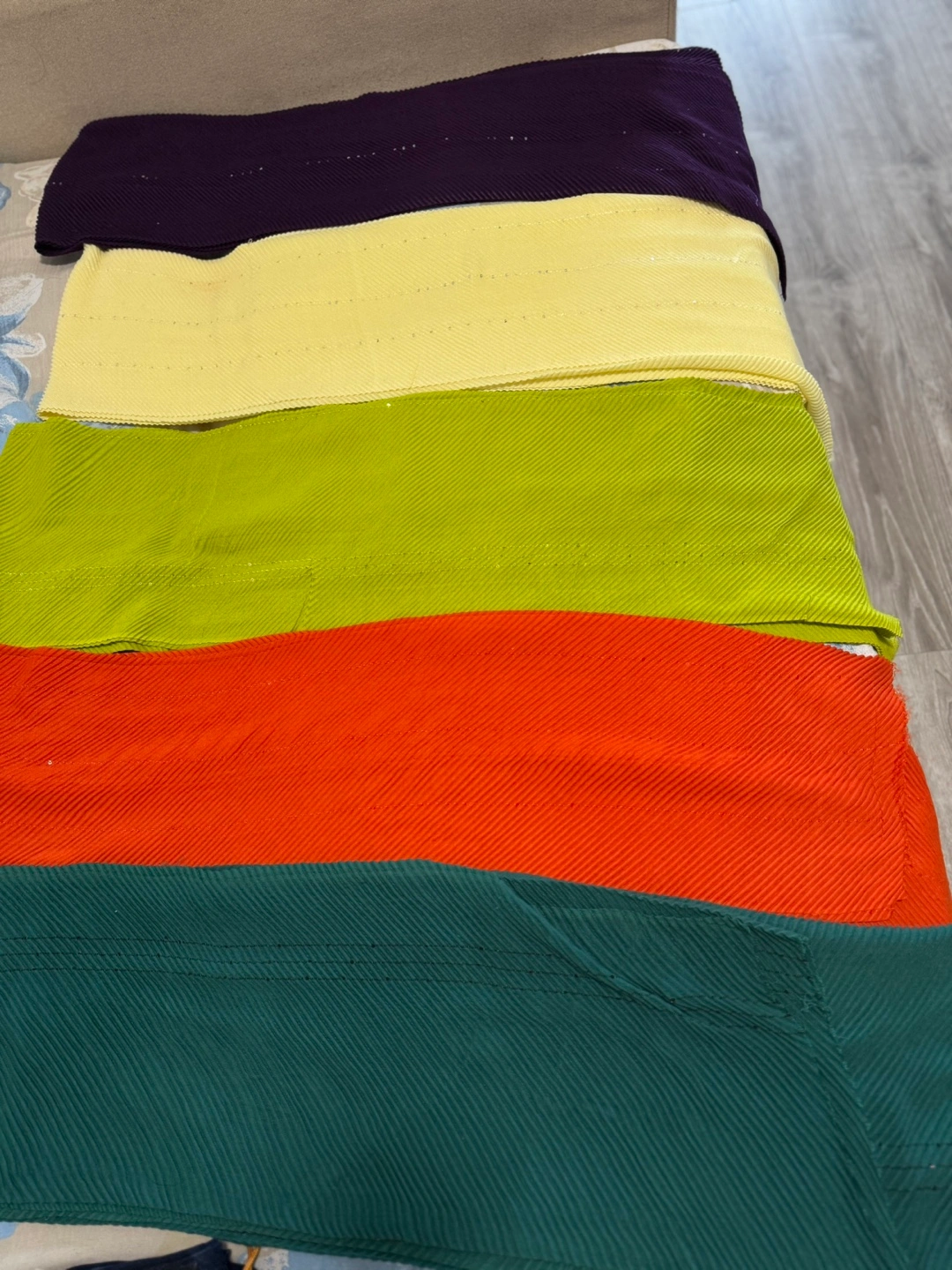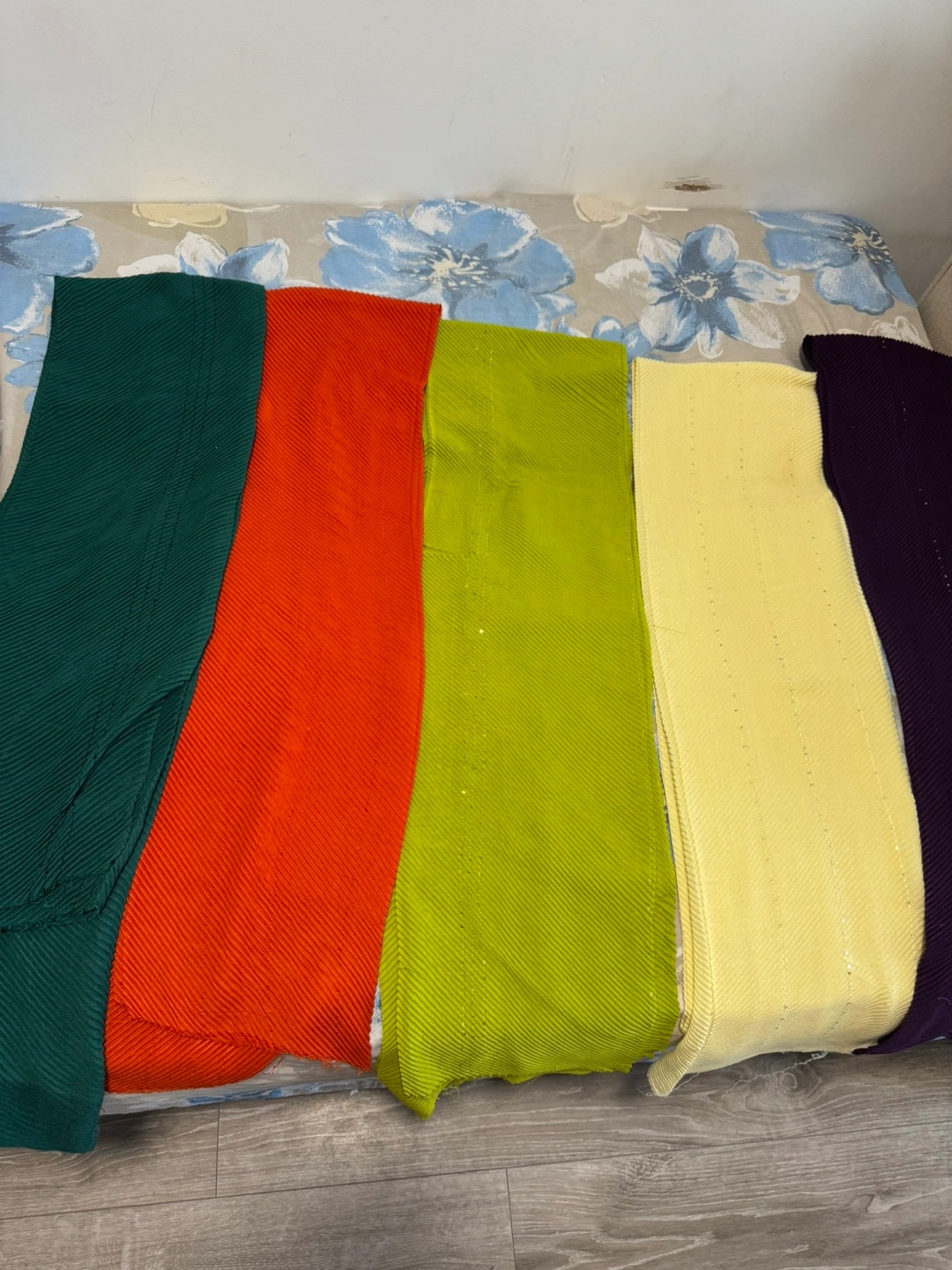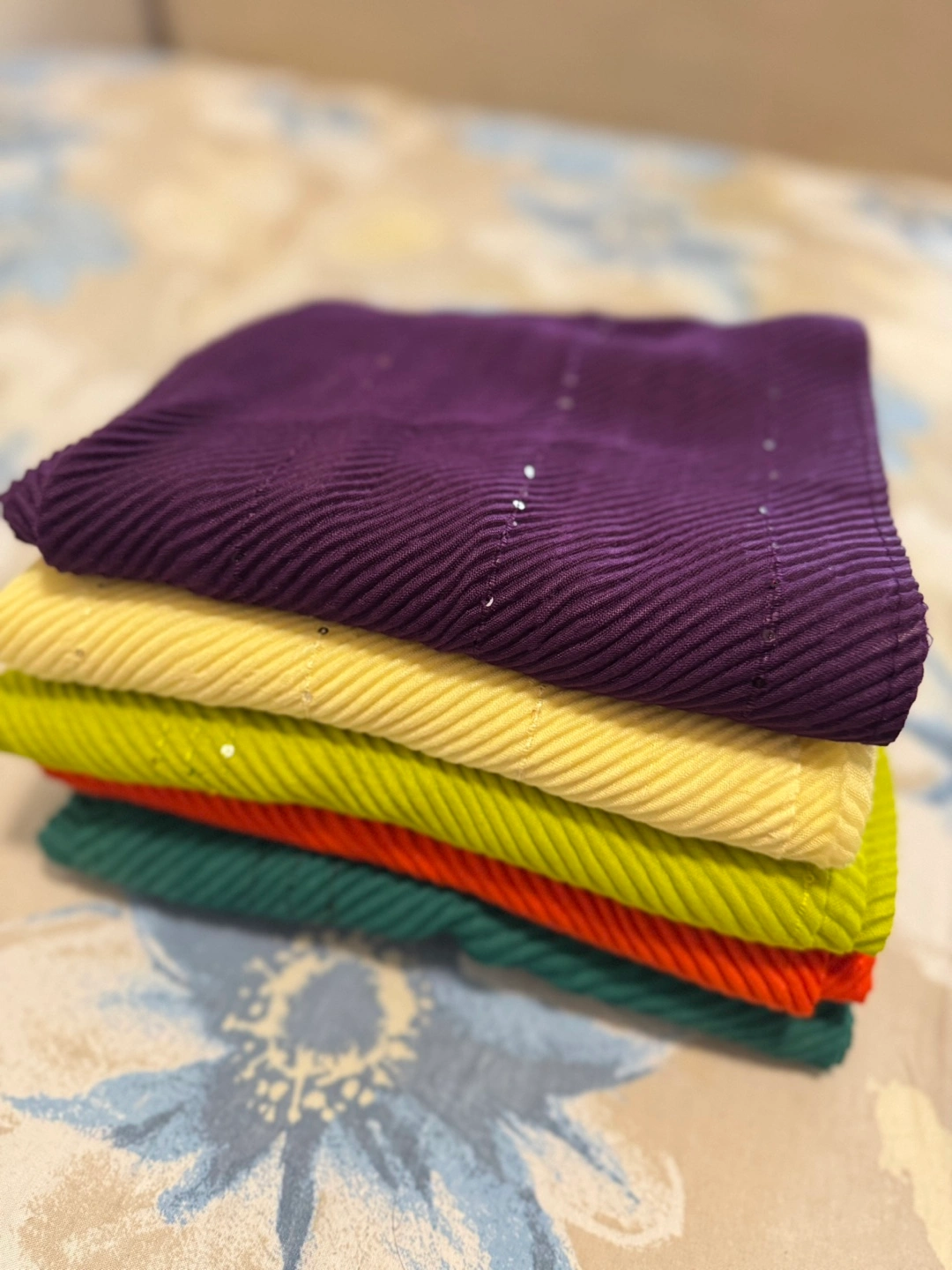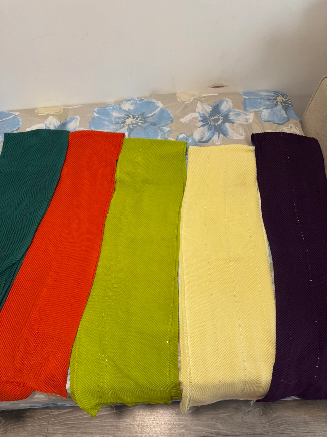 Brand new dopatta/hijab/scarves Five pleated scarves. Colours include purple, yellow, lime green, orange, and teal. Subtle embellishments. Lightweight material. Very comfortable and easy to carry. Totally unused . In A very fresh condition 10$ each