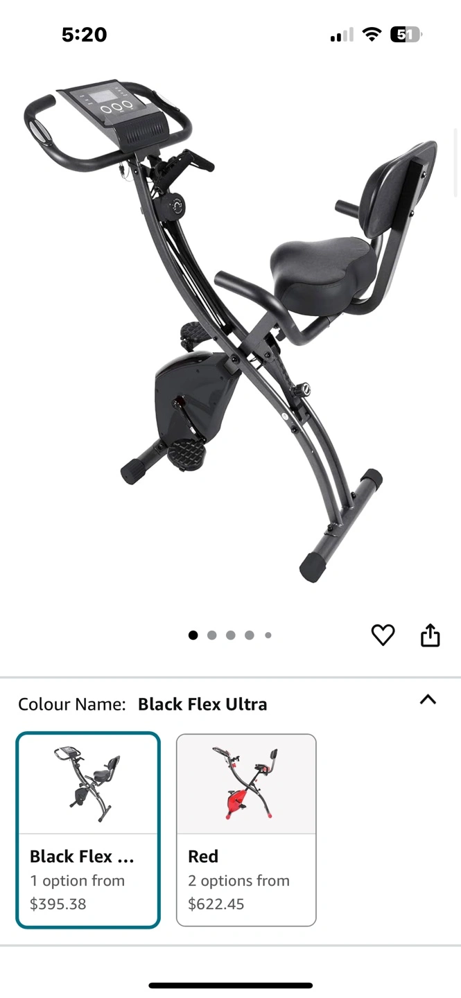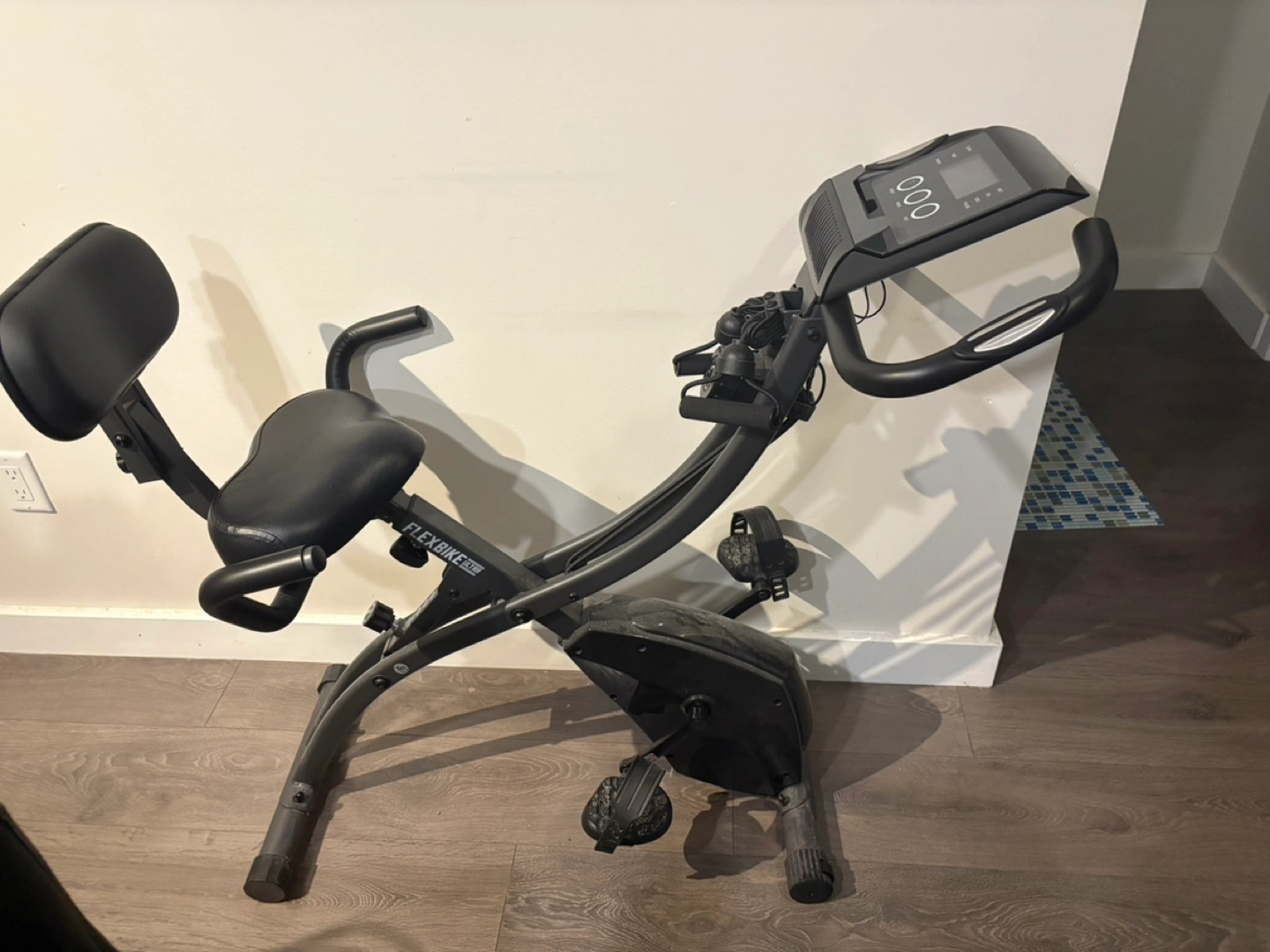 Pedal past all your goals with the black Flex Bike Ultra and bring maximum versatility to your workout. It functions as both a recumbent and classic upright to suit your fitness goals. Multiple levels of adjustable magnetic resistance ensure that you will be able to challenge yourself, while the built-in resistance bands allow you to work your upper body as well. The LCD display has six functions to track your progress: speed, time, distance, scan, calories, and pulse. When you are finished, simply fold-up and wheel away for easy storage. Excellent condition original price $300+ selling for $150.