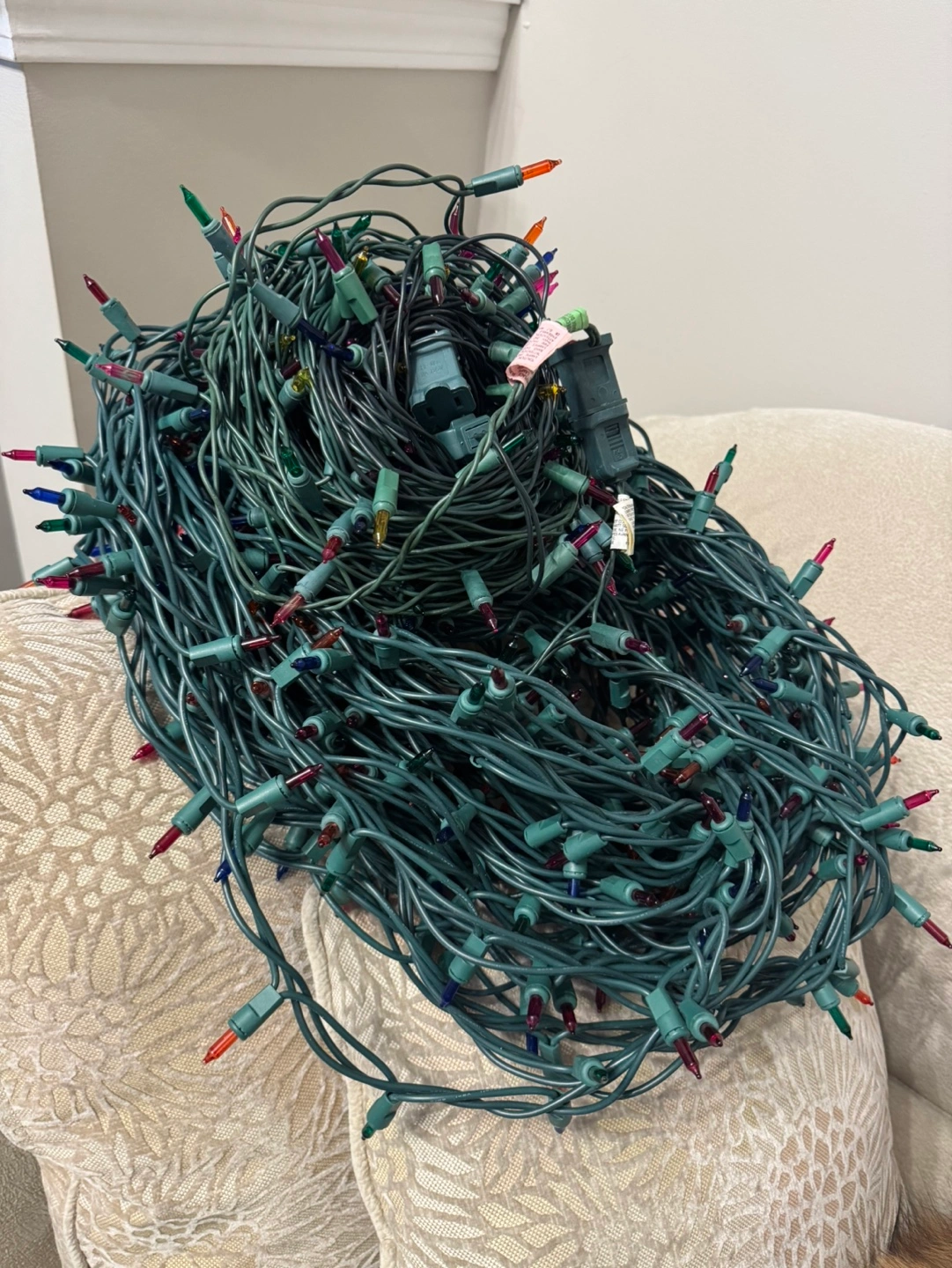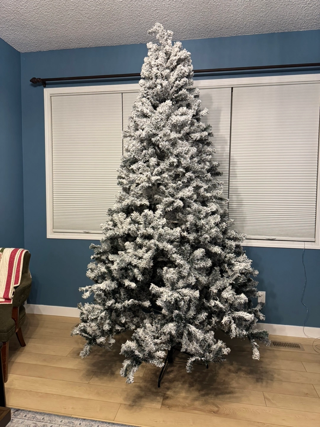 Flocked artificial Christmas tree. Stands 9 ft tall. (Not prelit) lights as well, in excellent shape