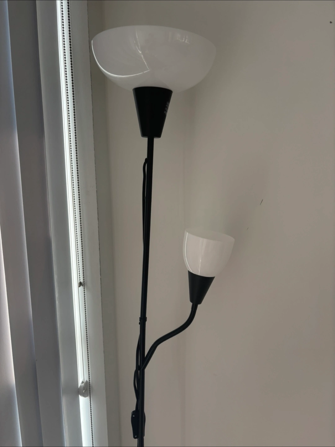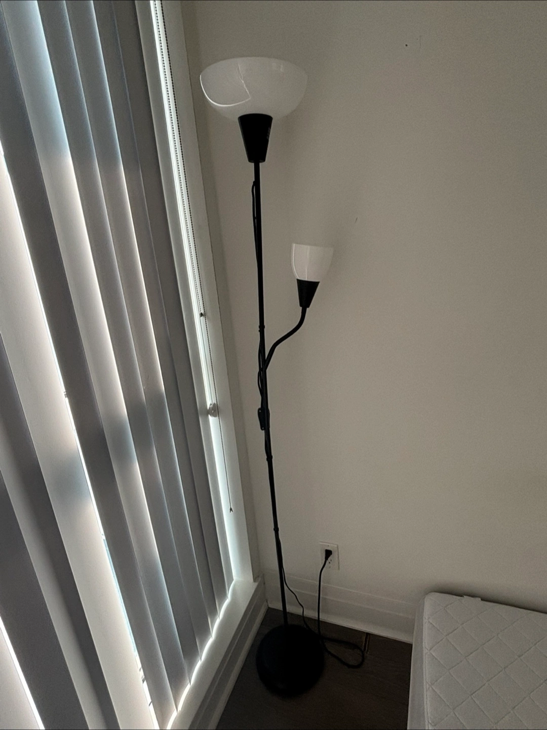 Black floor lamp with two lights. White lampshades. Includes a switch. Perfect for setting a relaxing mood.