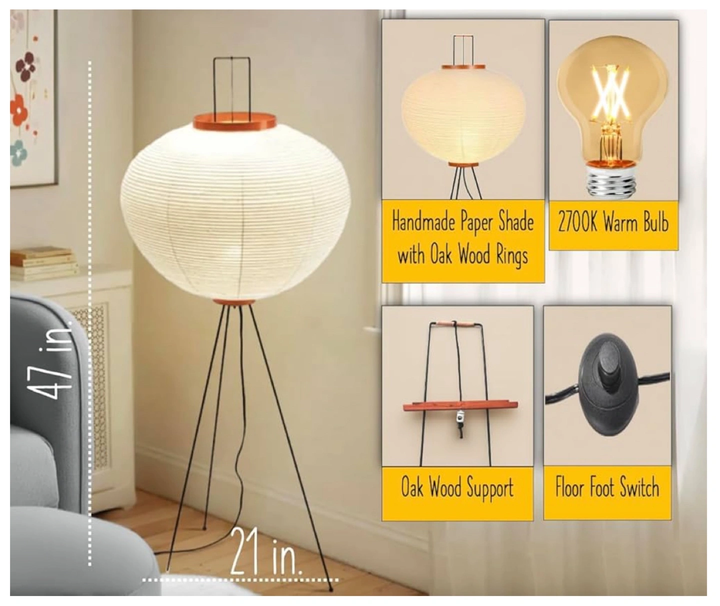 A stylish floor lamp, perfect for reading or simply relaxing. Featuring a handmade paper shade and an oak wood support. Included is a 2700K warm bulb and a floor foot switch for convenience.