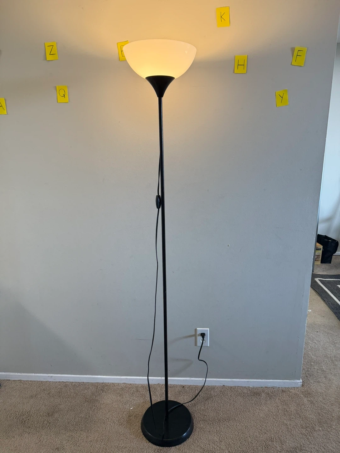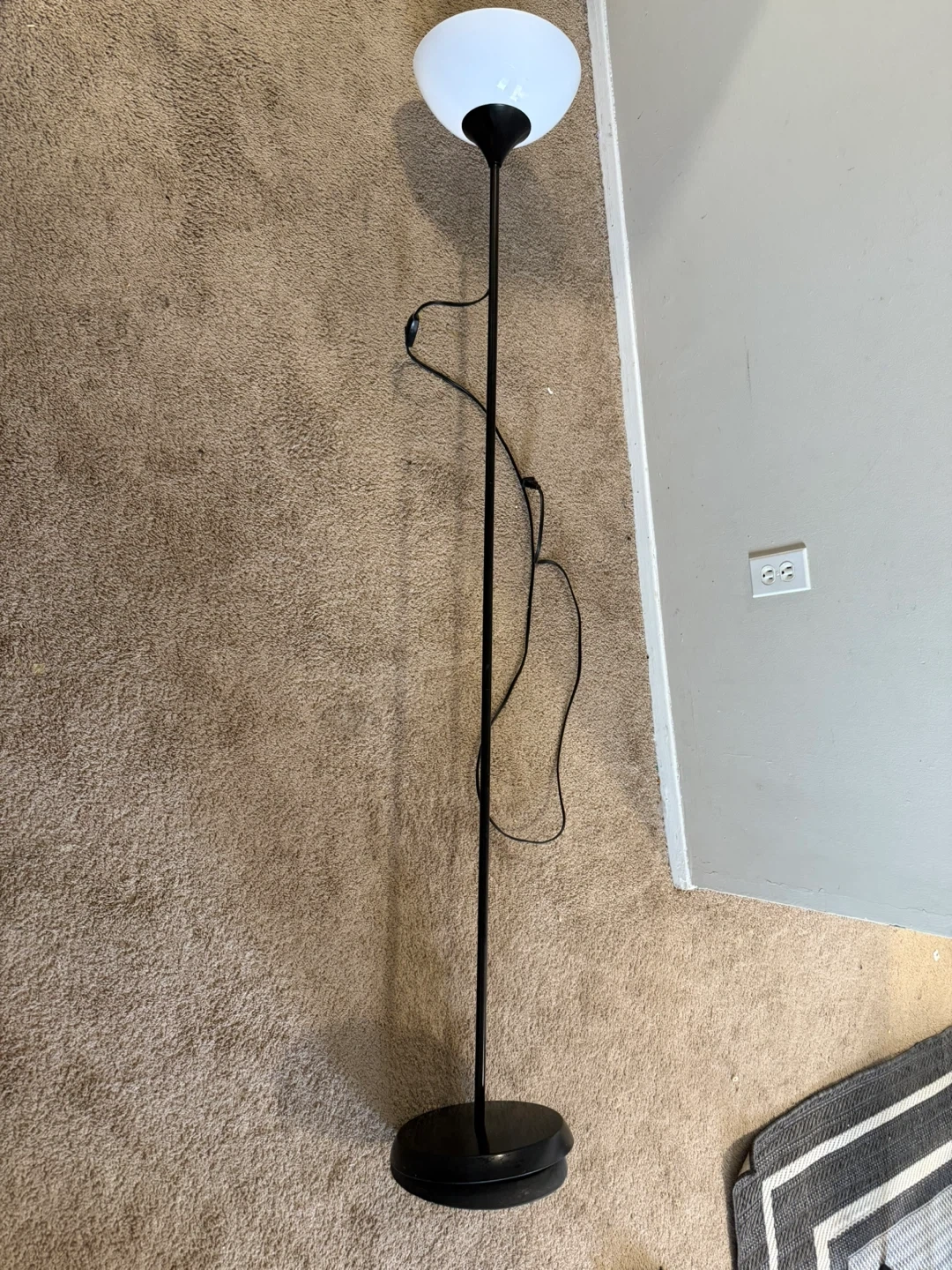 black floor lamp with a white shade! It's in great condition and would look lovely in any room. Pick up at Frobisher Lane.
