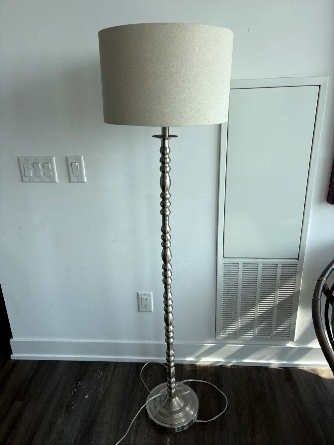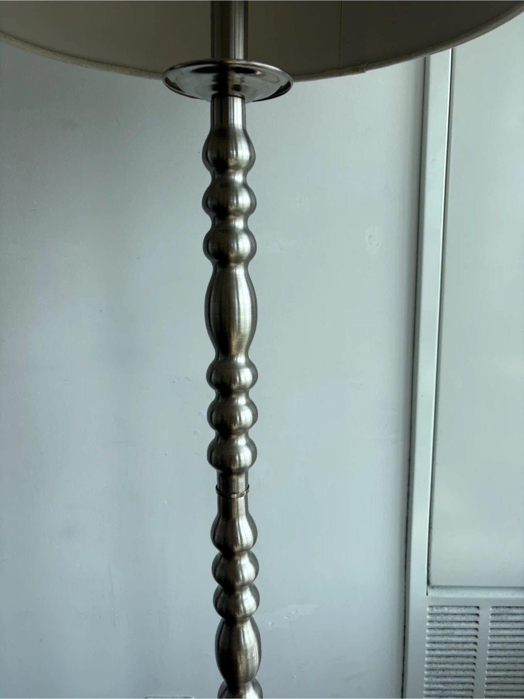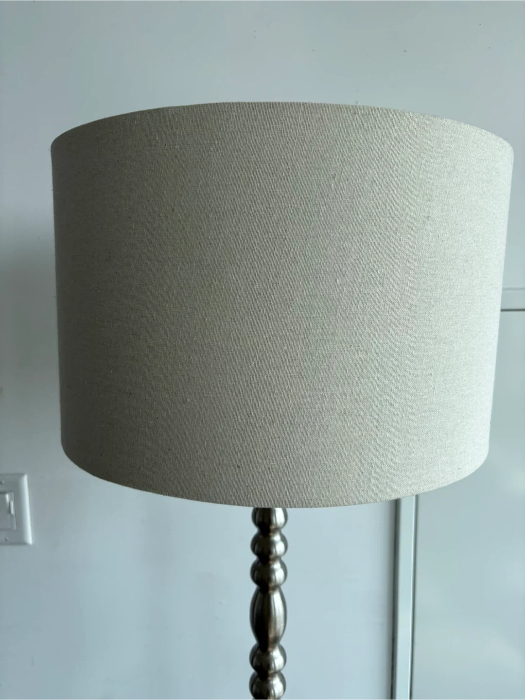 Here's a floor lamp with a beige shade and a silver-coloured base. It's in great shape and would look lovely in any room. Perfect for adding a warm glow to your living space or bedroom