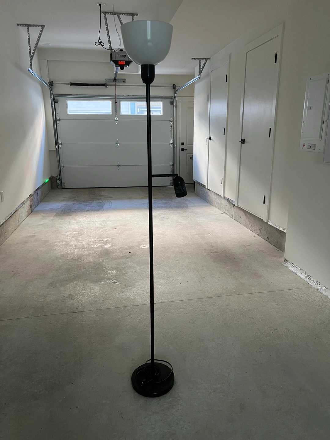 Selling a floor lamp in good condition. It features a black stand and a white lampshade. Great for adding some light to any room!