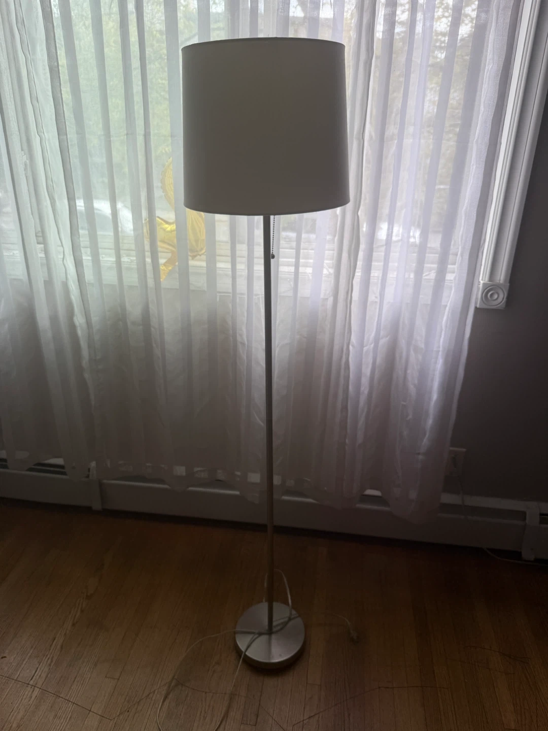 Selling a floor lamp with a silver finish! It's in great condition and would be a lovely addition to any room. The shade is a neutral white colour, so it will match any decor. It's easy to assemble and provides a nice ambient light