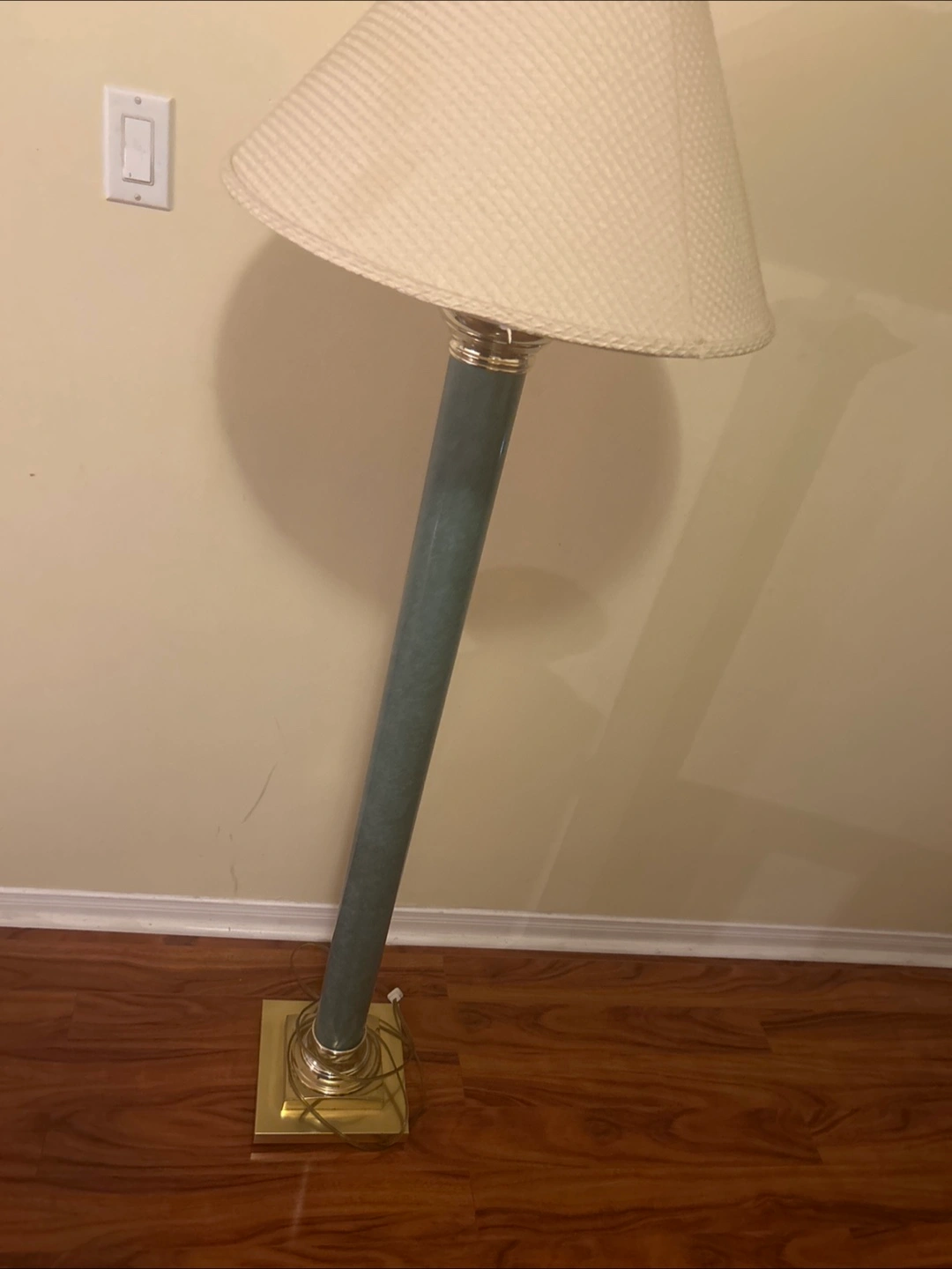 Selling a floor lamp featuring a beige lampshade and a green body. It would look great in any living room or bedroom