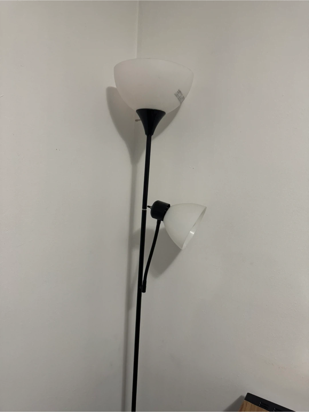 Selling a floor lamp with an adjustable reading light. It's in great condition and perfect for adding some extra light to any room. The main lamp has a bowl-shaped shade, and the reading light can be directed where you need it